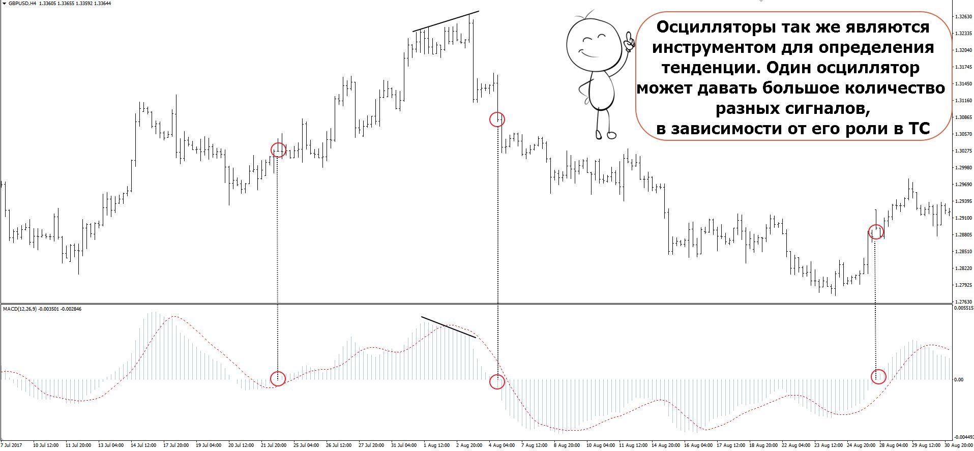 Таким образом индикатор помогает предугадать разворот или формирование нового тренда. Осцилляторы, используемые в трейдинге на Форекс, особо эффективны при спокойном состоянии рынка.