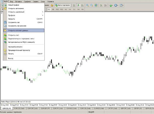 3. Откройте торговый терминал, зайдите в раздел «Файл», выберите «Открыть каталог данных» и скопируйте в него всё содержимое второй папки.