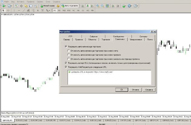 4. В настройках МТ4 в окне вкладки «Советники» отметьте галочкой первое и два последних поля.