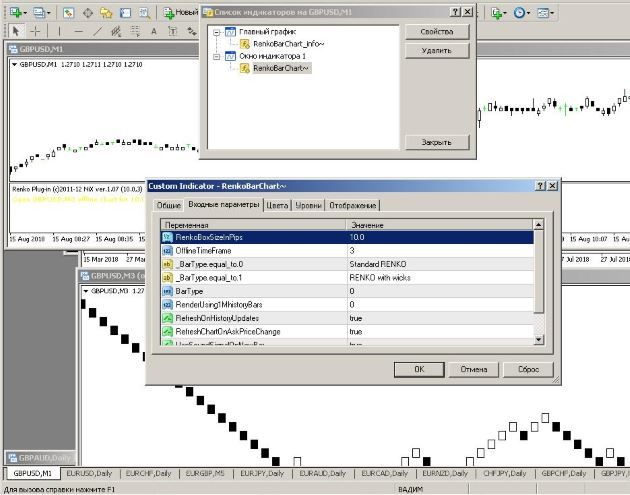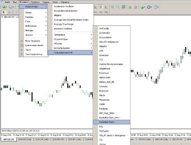 7. На этом графике зайдите в раздел «Вставка», выберите «Индикаторы», «Пользовательские» и откройте RenkoBarChart.