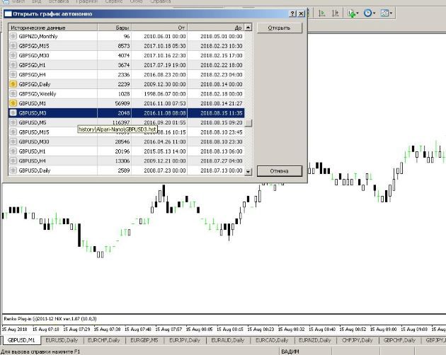 8. Зайдите в раздел «Файл», выберите «Открыть автономно» и в выпадающем списке графиков выберите торгуемый рыночный актив с таймфреймом М3.