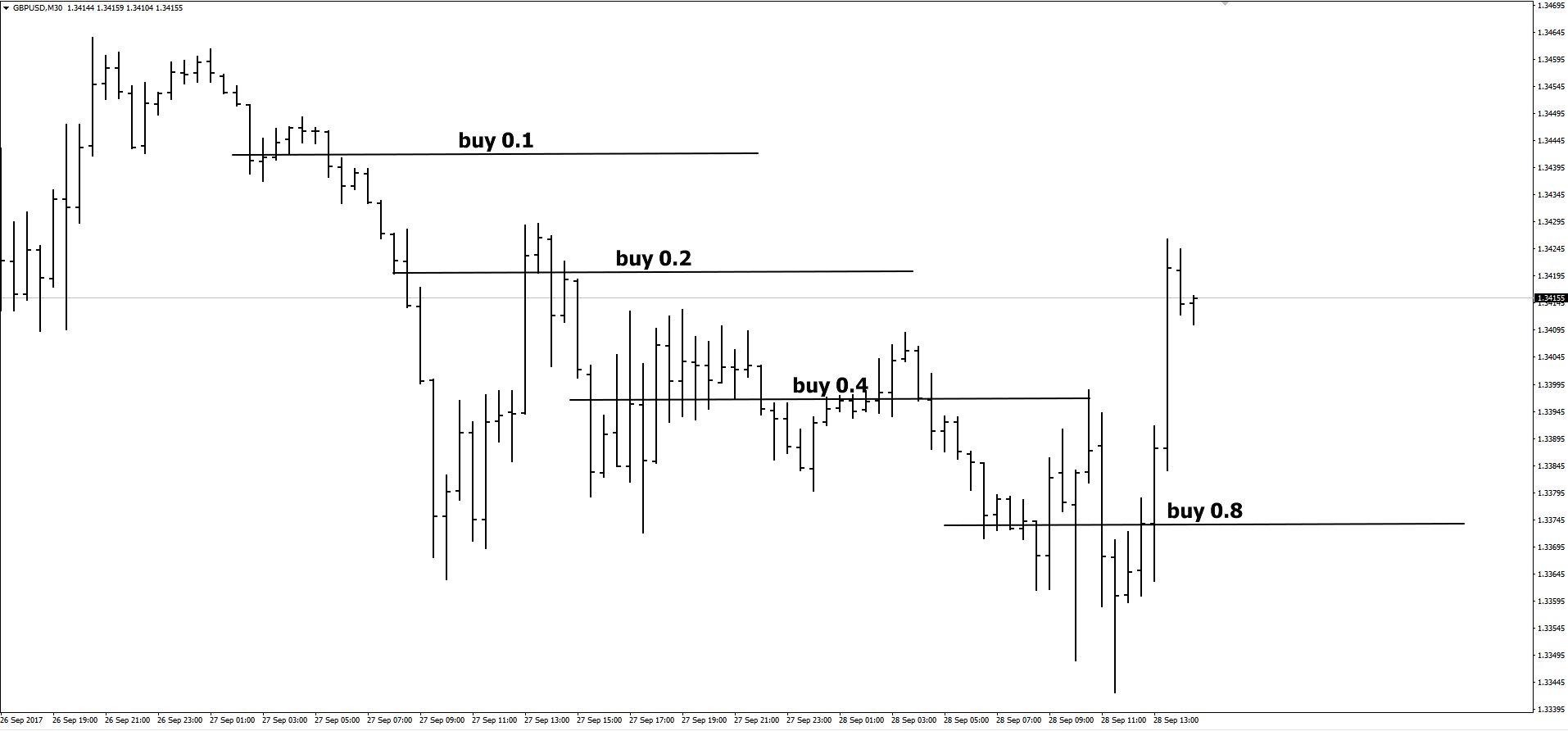 В применении к валютному рынку Форекс система Мартингейл несколько изменяется и редко используется в чистом виде. Основная её суть — построение сетки ордеров, при которой в каждом новом ордере увеличивается объём.