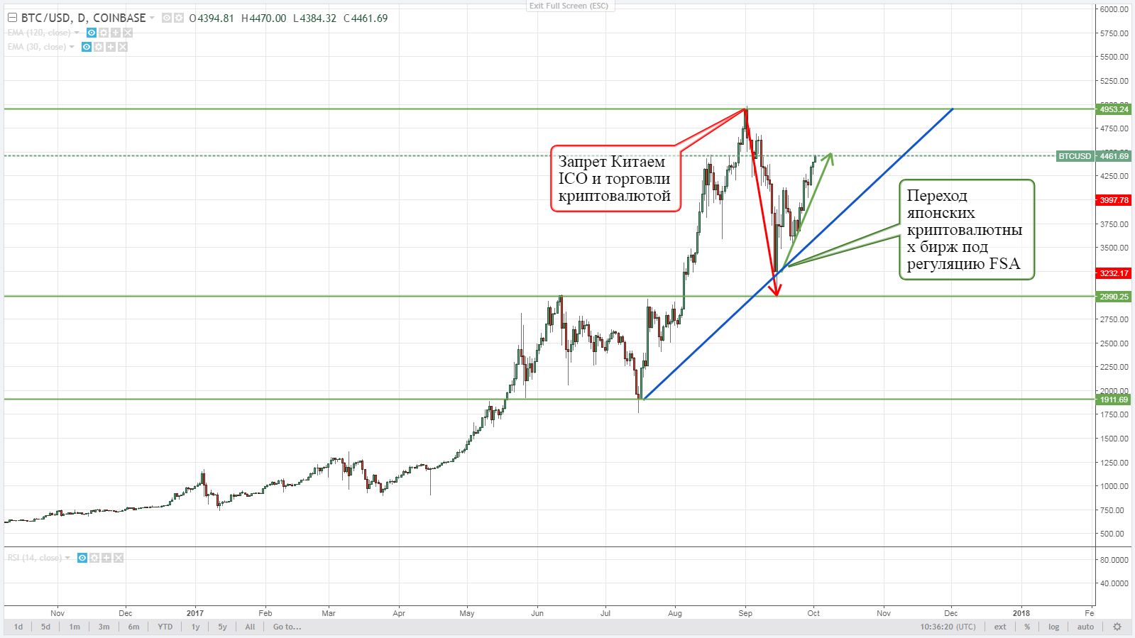 Как можно наблюдать на графике изменения стоимости bitcoin, решение Народного банка Китая о запрете проведения ICO и запрет на деятельность криптовалютных бирж в Китае кардинально повлияло на состояние рынка, обвалив котировки bitcoin и других криптовалют, чуть было не разрушив рынок в целом.