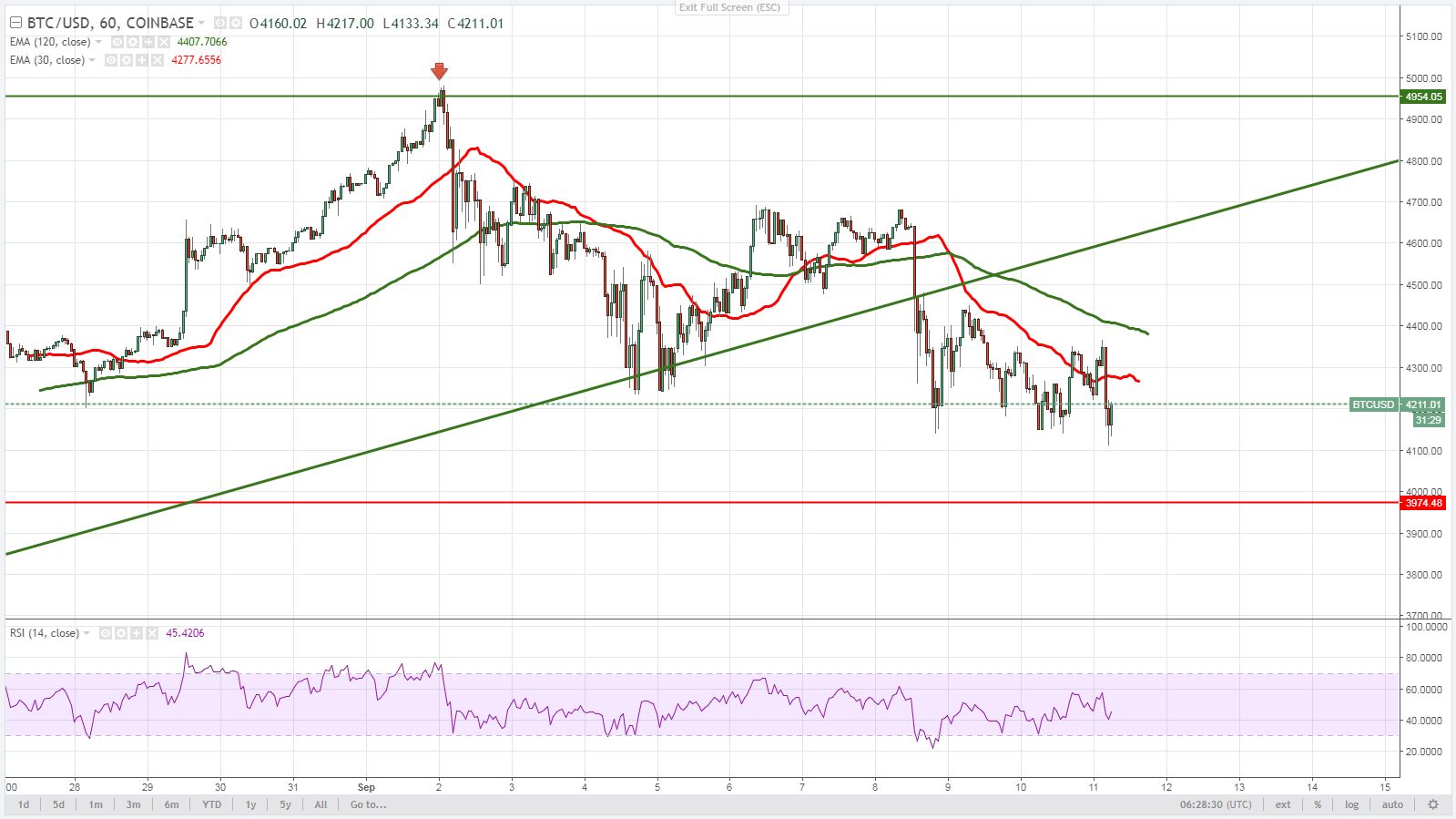 Что привело хоть и к незначительным, на фоне глобального тренда, но все же довольно неприятным изменениям цены. Котировки Bitcoin отправились ниже промежуточного уровня поддержки $4300.
