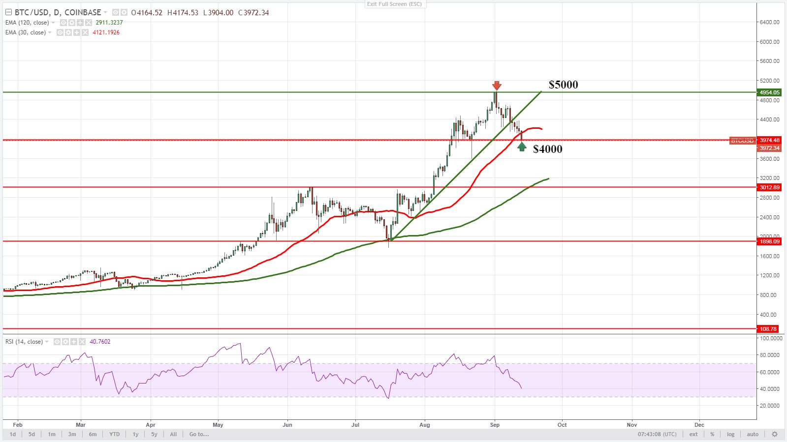 Утром 13 сентября Bitcoin опустился ниже уровня поддержки $4000, однако он остается в рамках торгового диапазона $4000 - $5000.