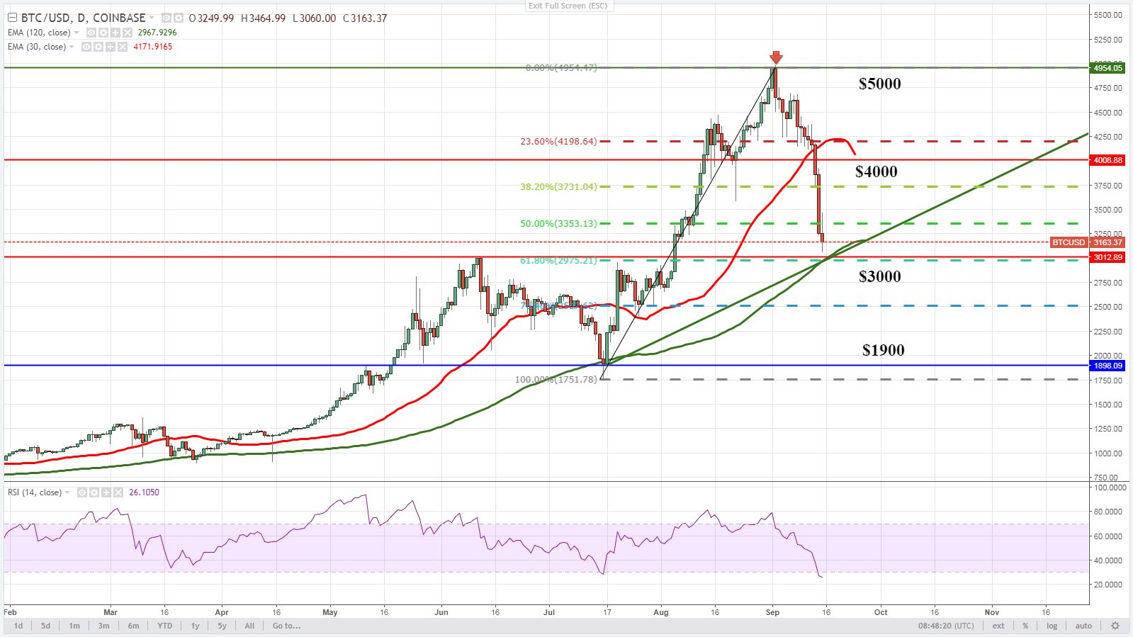 Если отметка $3000 сможет выстоять, получив дополнительную поддержку от 120 дневной EMA, тогда можно будет наблюдать формирование восходящего торгового импульса с ближайшей целевой отметкой $4000, что определит завершение коррекции на уровне 61,8 Fibo.