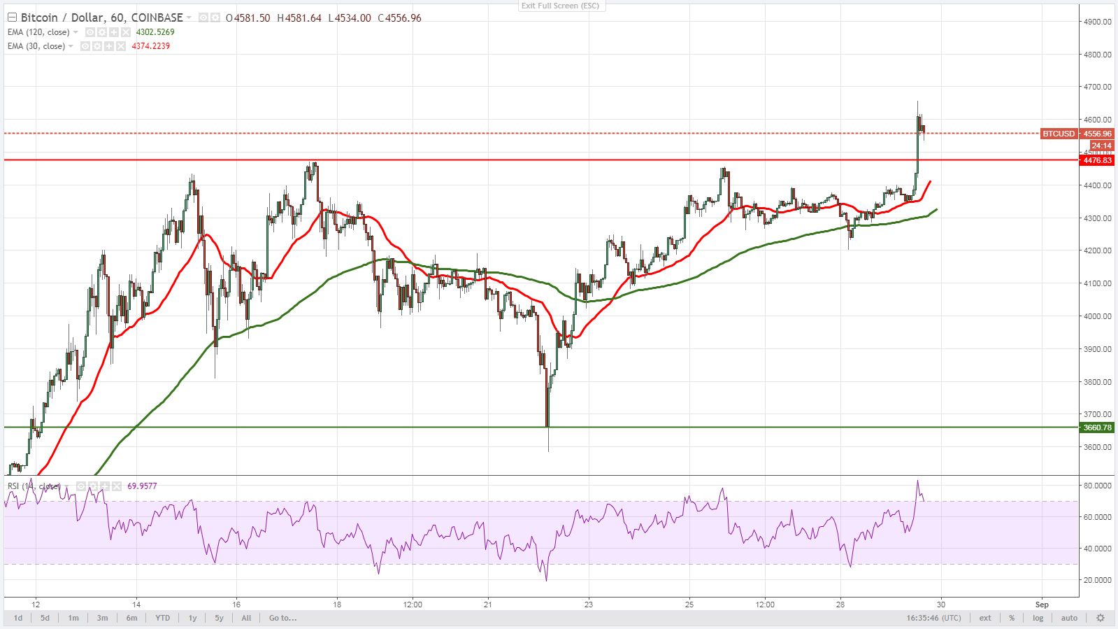 Отметка $4500 была преодолена около 13:00 GMT 29 августа, отправив цену к значению $4657, показав прирост внутри дня на 7,3 %.