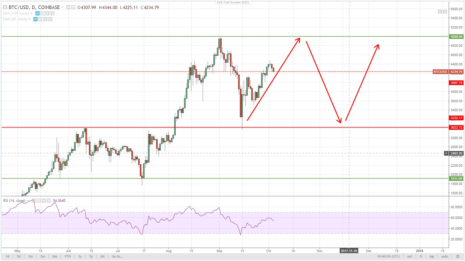 Но как теперь мы можем видеть на графике bitcoin его цена отбившись от отметки $5000 опустилась строго к предыдущему историческому максимуму находящемуся на отметке $3000 обозначив четкие границы рынка.