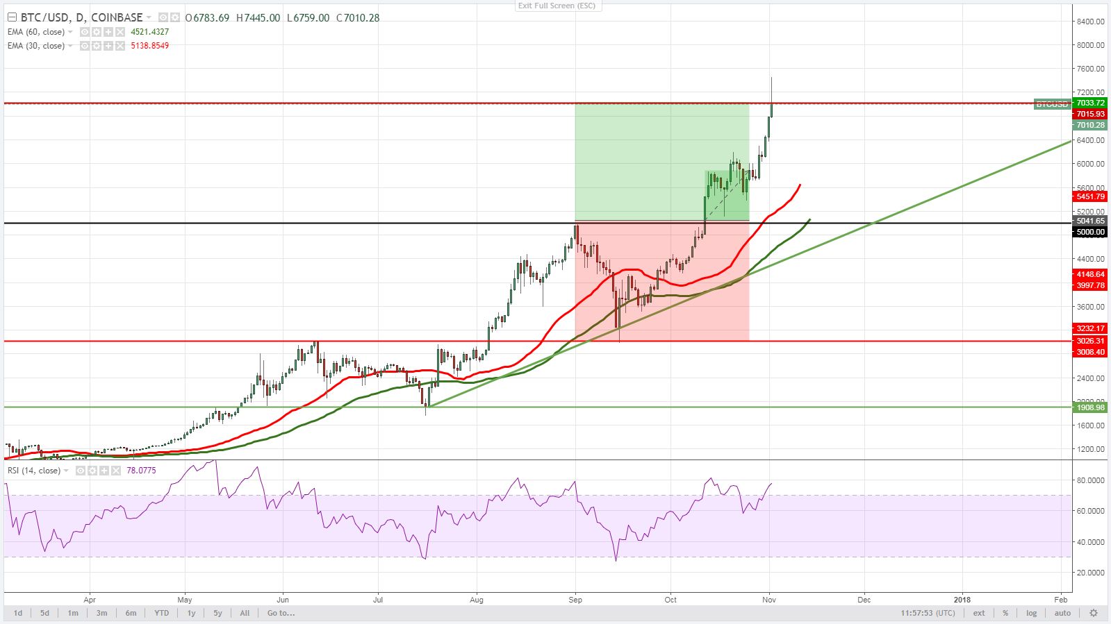 Так ширина нижнего диапазона $3000 – $5000, позволила сделать прогноз достижения ценой Bitcoin отметки $7000. После преодоления уровня сопротивления, что уже случилось в ходе торгов 2 ноября.
