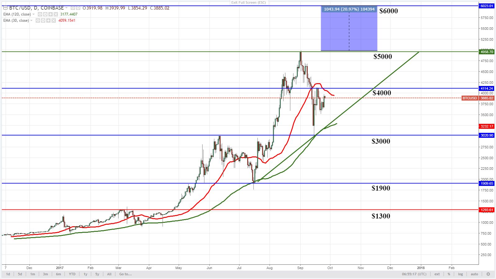 Если взглянуть на график bitcoin среднесрочно и увязать его восходящий тренд с новостями из Японии, то можно сделать вывод, что его котировки находятся в нижней половине торгового диапазона $3000 - $5000, продолжая торговаться ниже психологического уровня $4000.