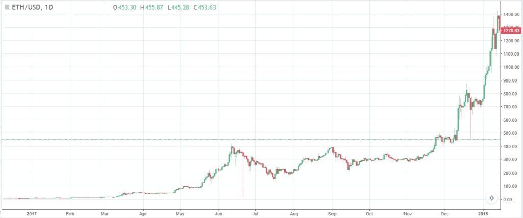 Аналогично и с валютой Ethereum. На графике ниже видно, как стремительно повышалась стоимость монеты с лета 2017 года.