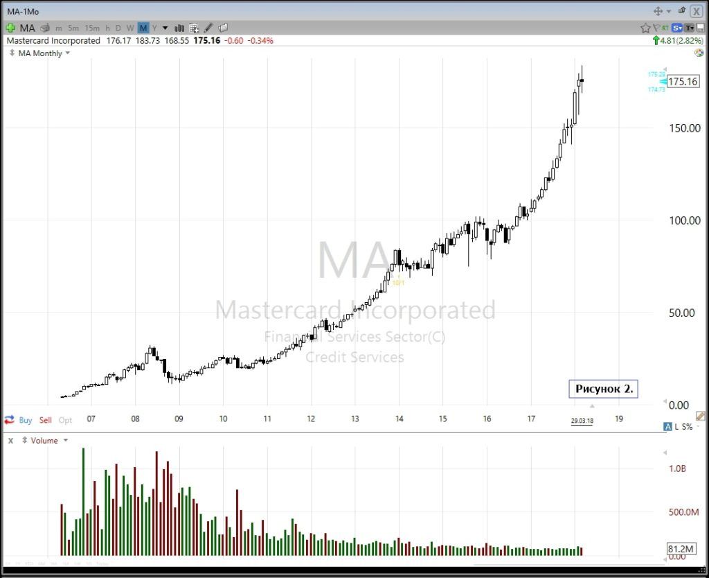 Те, кто вовремя увидел потенциал в компаниях VISA (рис. 1) или MasterCard (рис. 2), ставшими всемирно известными платёжными системами, ещё и дополненный выплатами дивидендов, действительно заработали внушительные суммы.