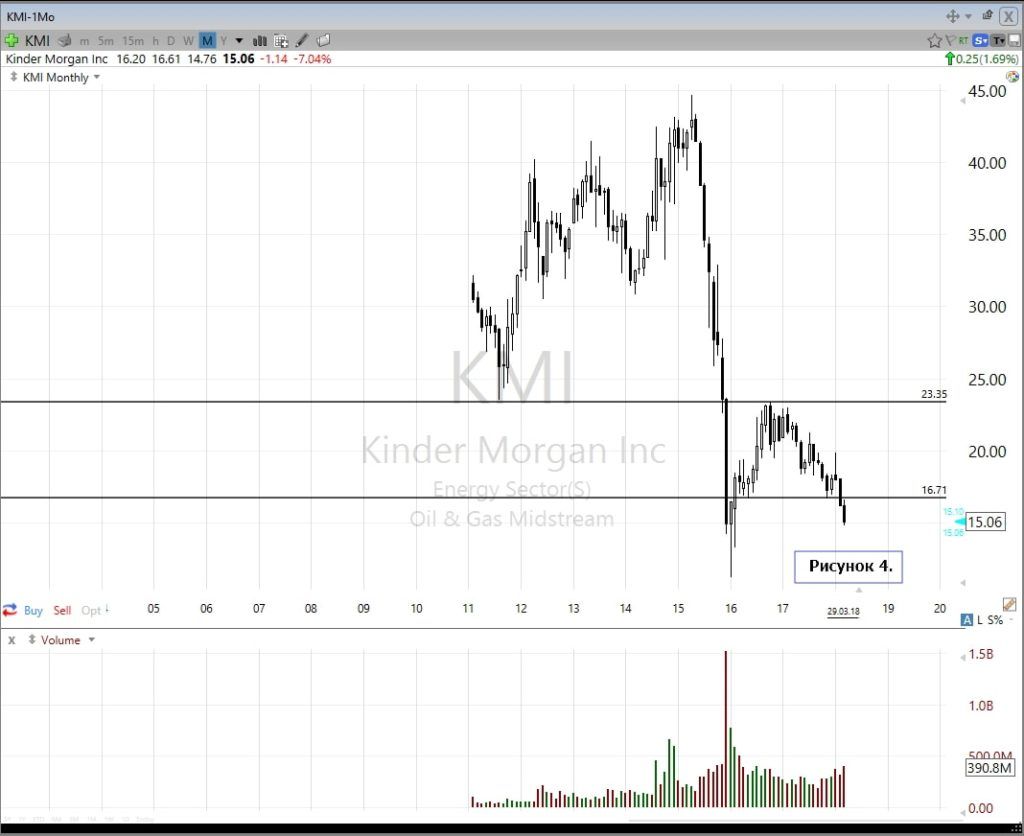 А вот пример из компаний, которые ещё на плаву, но бурный старт в настоящее время сталкивается не с самой приятной картиной. Kinder Morgan Inc. из нефтегазового сектора, причём акции даже не смогли восстановиться вслед за укреплением цен на нефть.