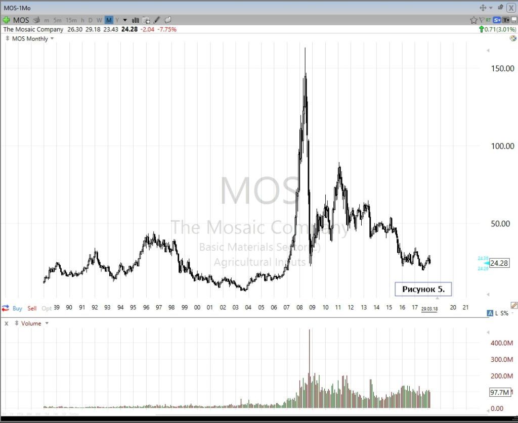 Или компания из агросектора The Mosaic Company, которая также оптимистично взлетела с 2004 года и после кризиса 2008 года попыталась повторить успех ещё раз. Но инвесторы оценили, что компания не стоит тех сотенных цен, и эмитент даже не дотянул до пятидесяти.