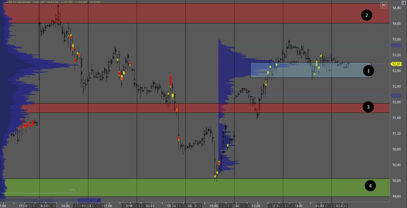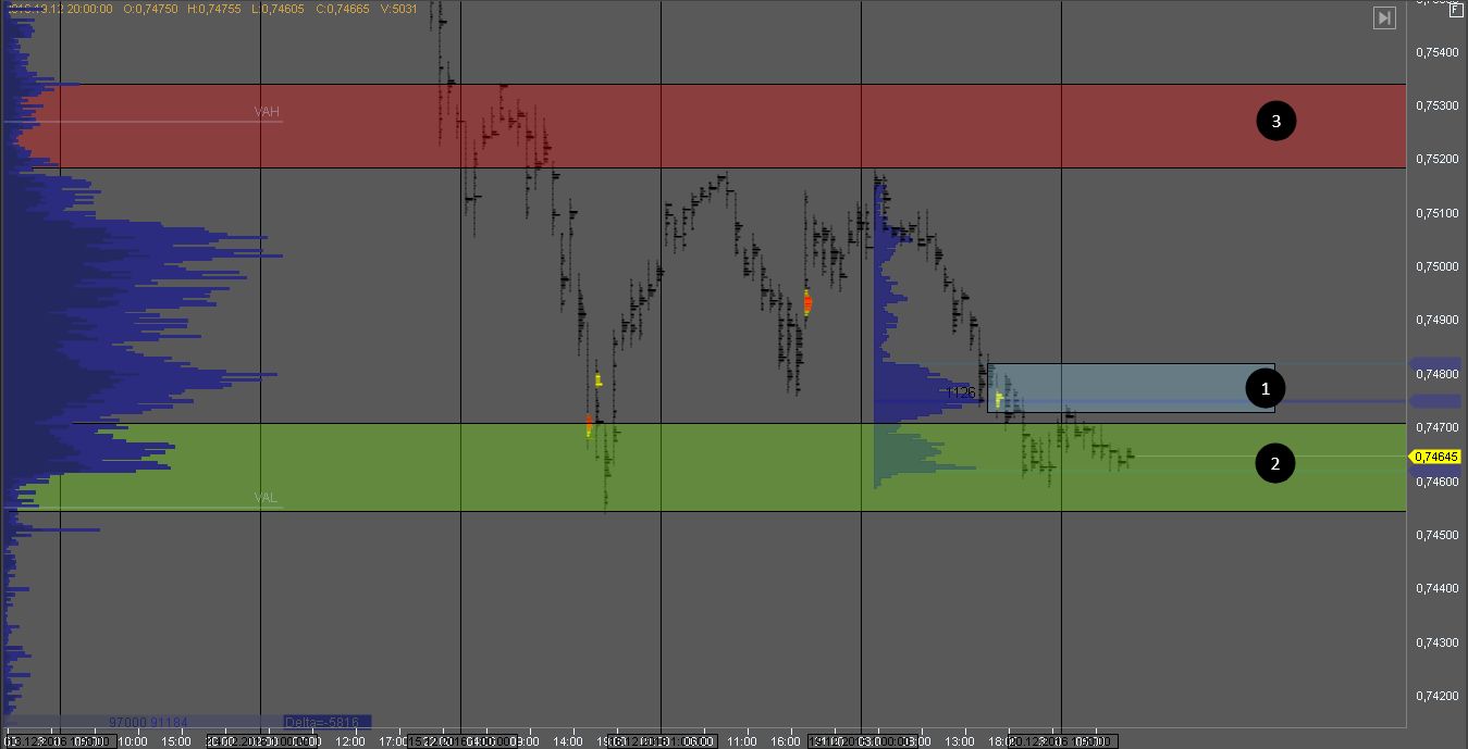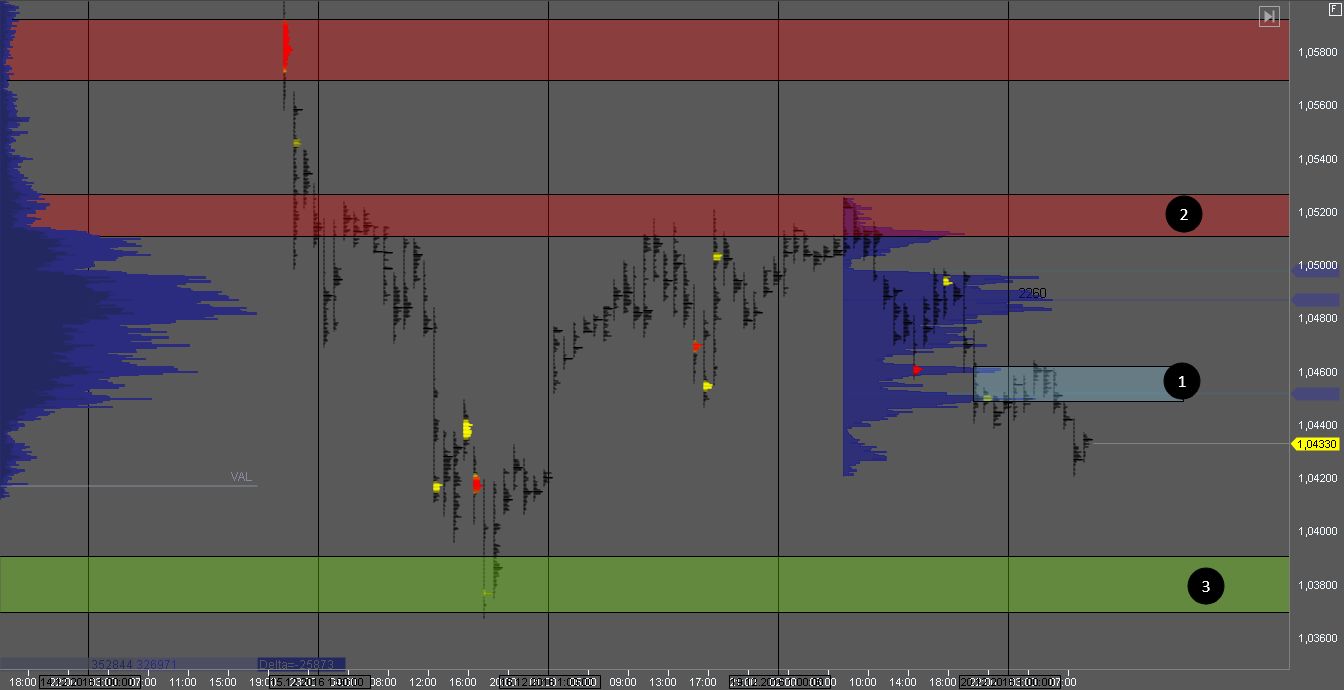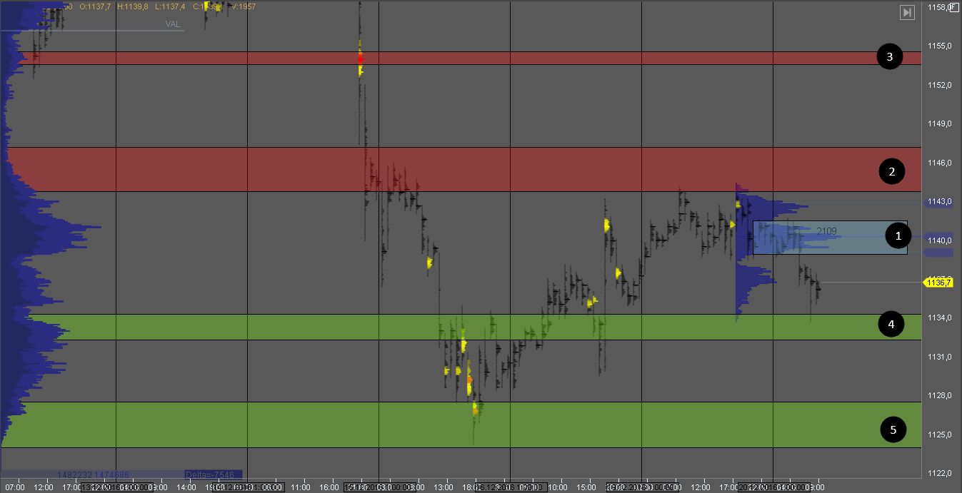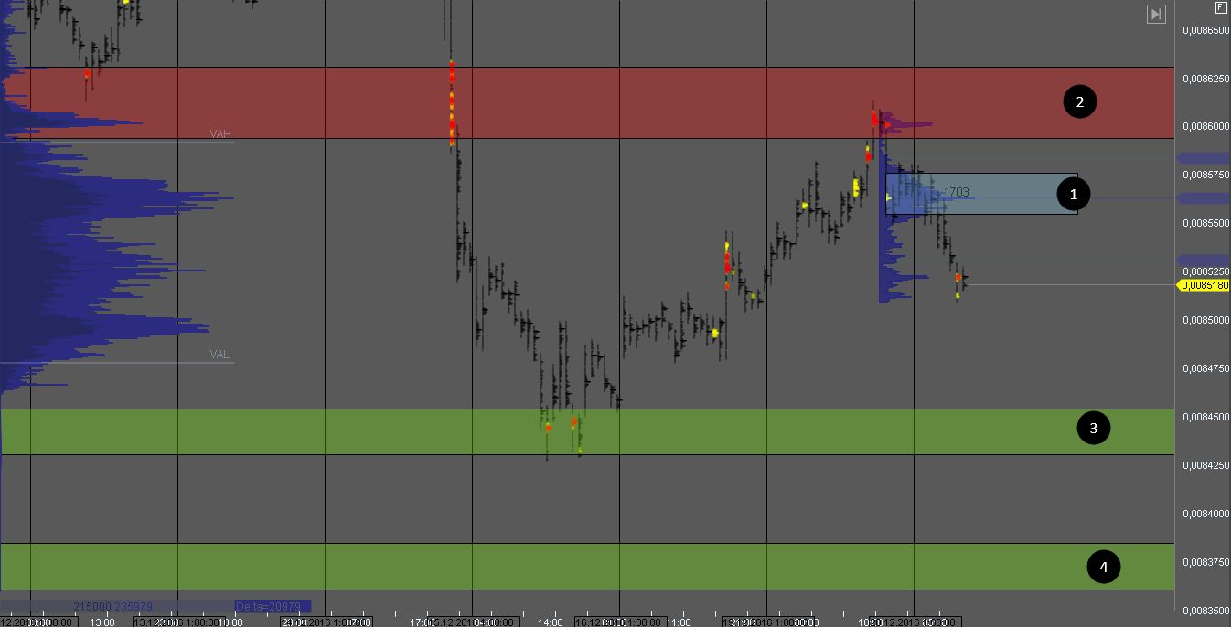 Продавец не пустил покупателя выше зоны сопротивления 2, и после остановки движение вниз возобновилось. Внутри дневная зона 1 выступает неплохим местом для поиска краткосрочных продаж. Основная цель для продавцов зона 5, но зона поддержки 4 так же выступает неплохим местом для поиска краткосрочных покупок.