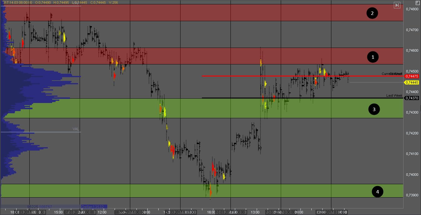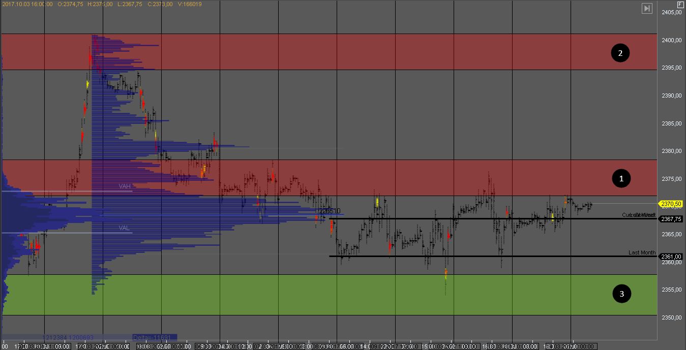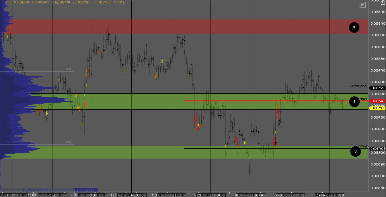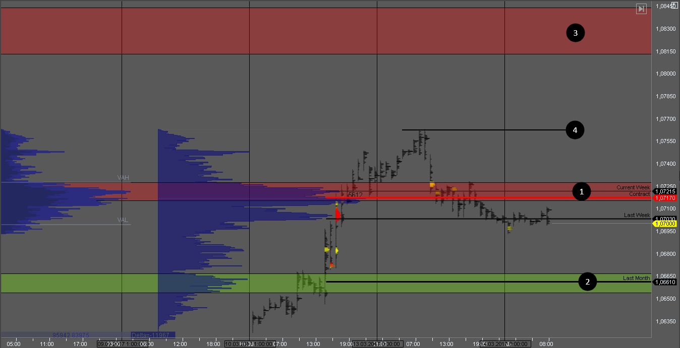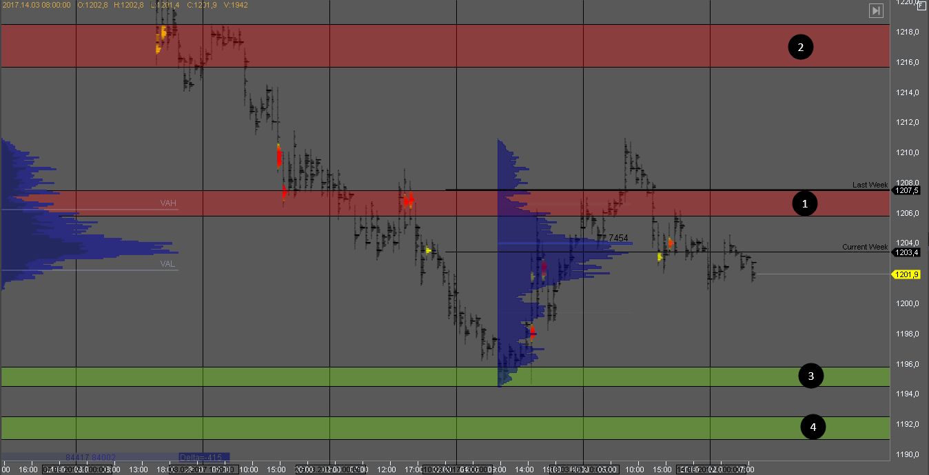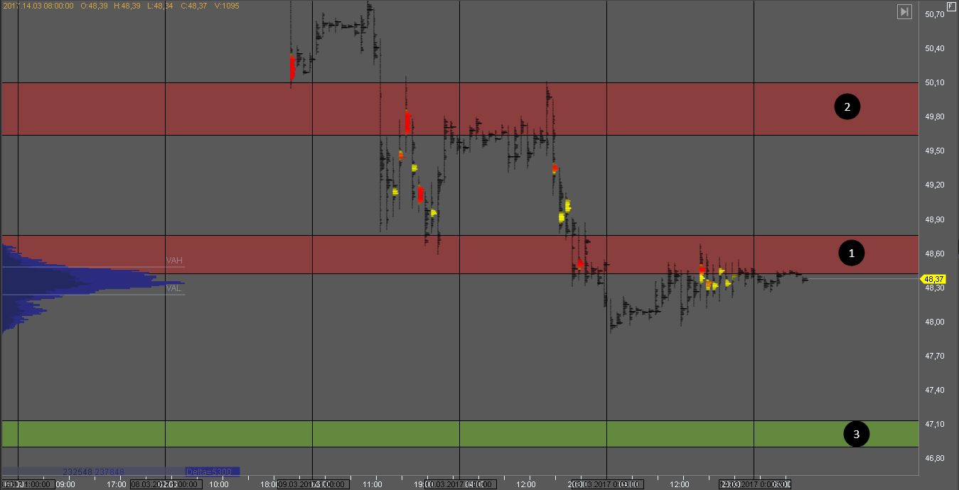 Продавец пытается продавить объем нового контракта в зоне 1. Пока мы торгуемся ниже него, можно рассматривать продажи от этого сопротивления.