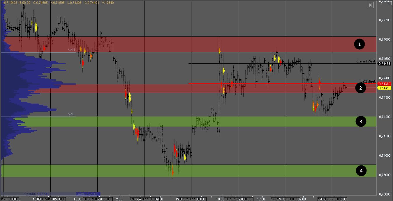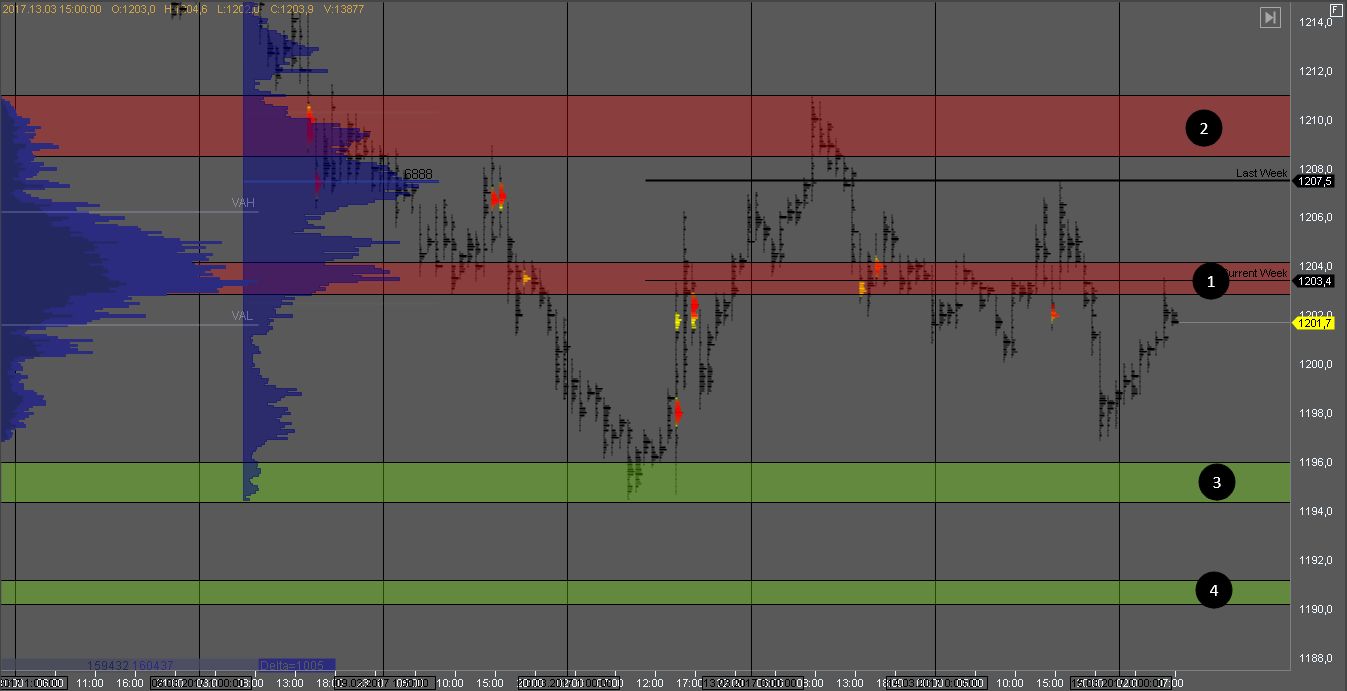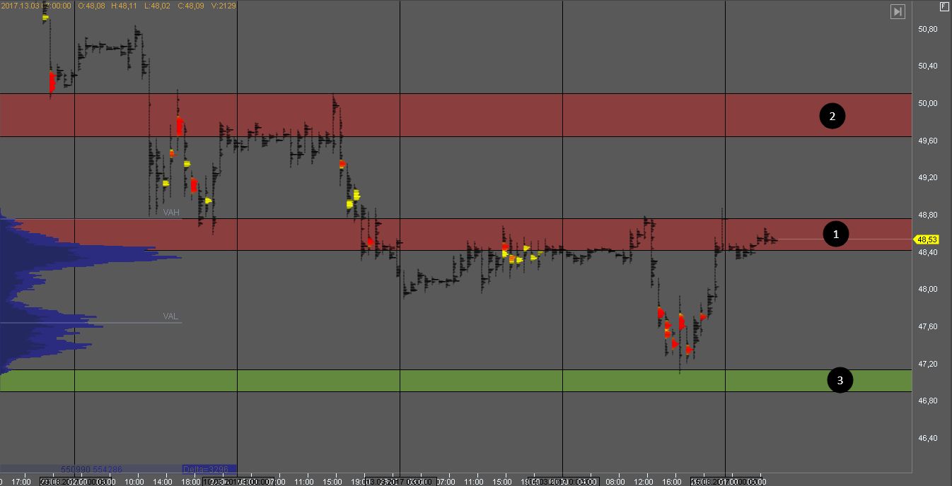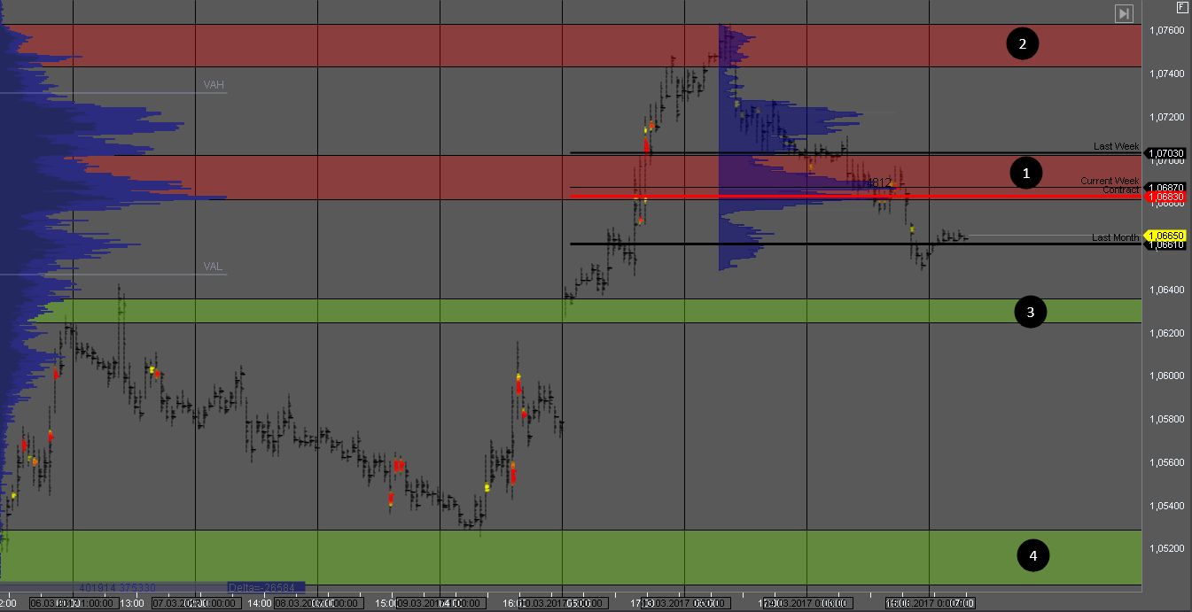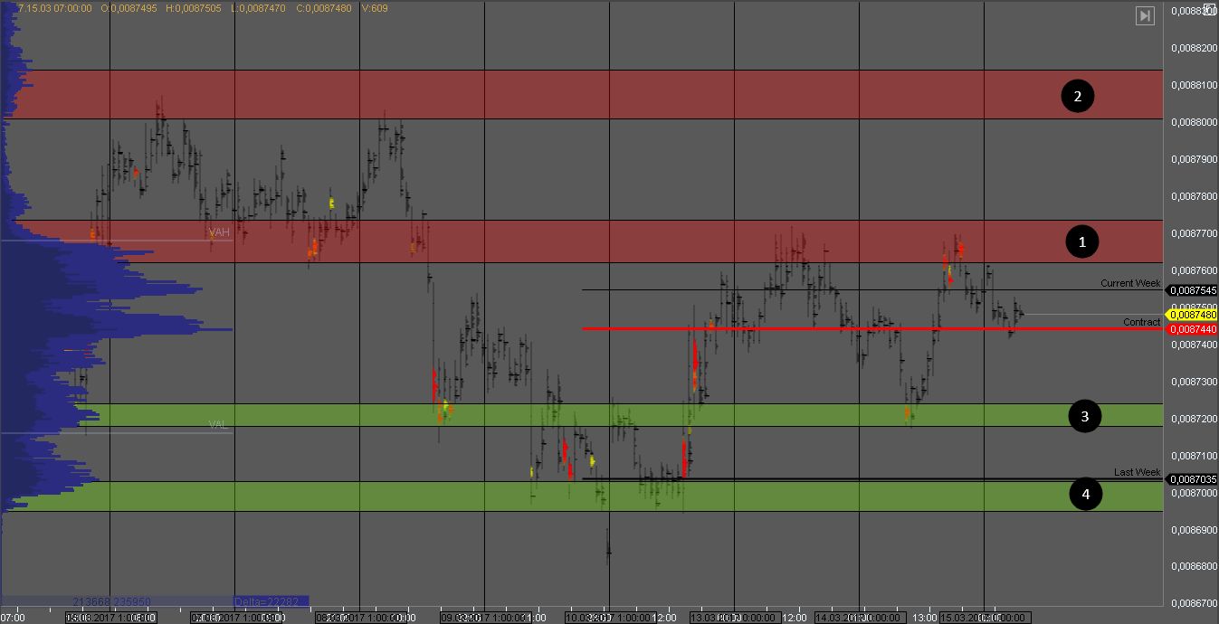 Но в случае пробоя зоны 1, мы получим признаки силы покупателя и можем поискать возможности для покупки с целью в зоне 2. Цель для продавцов - зоны 3 и 4.