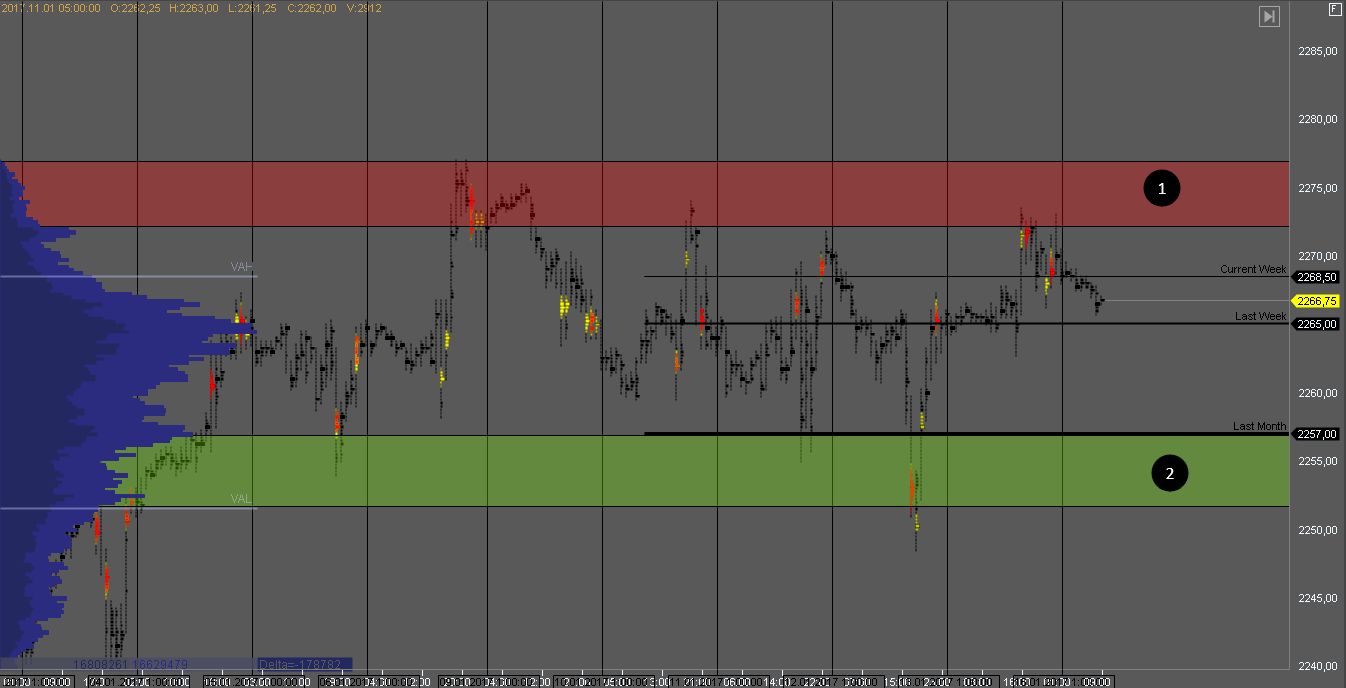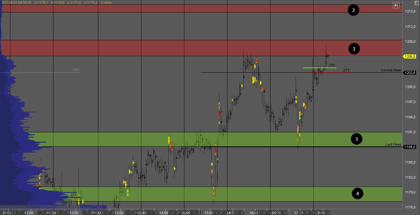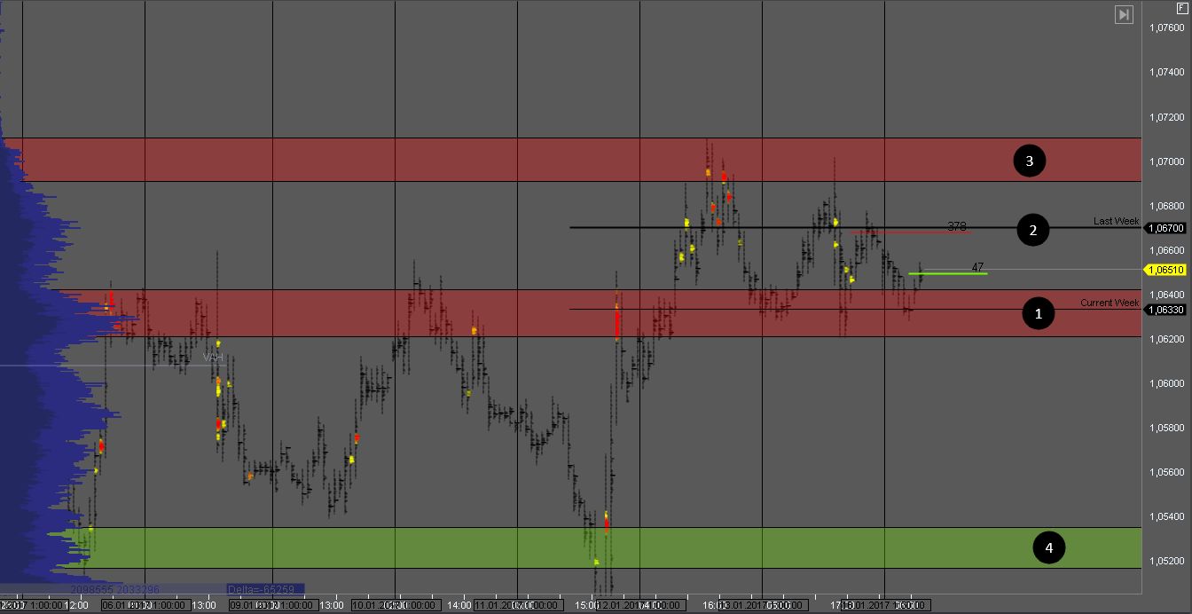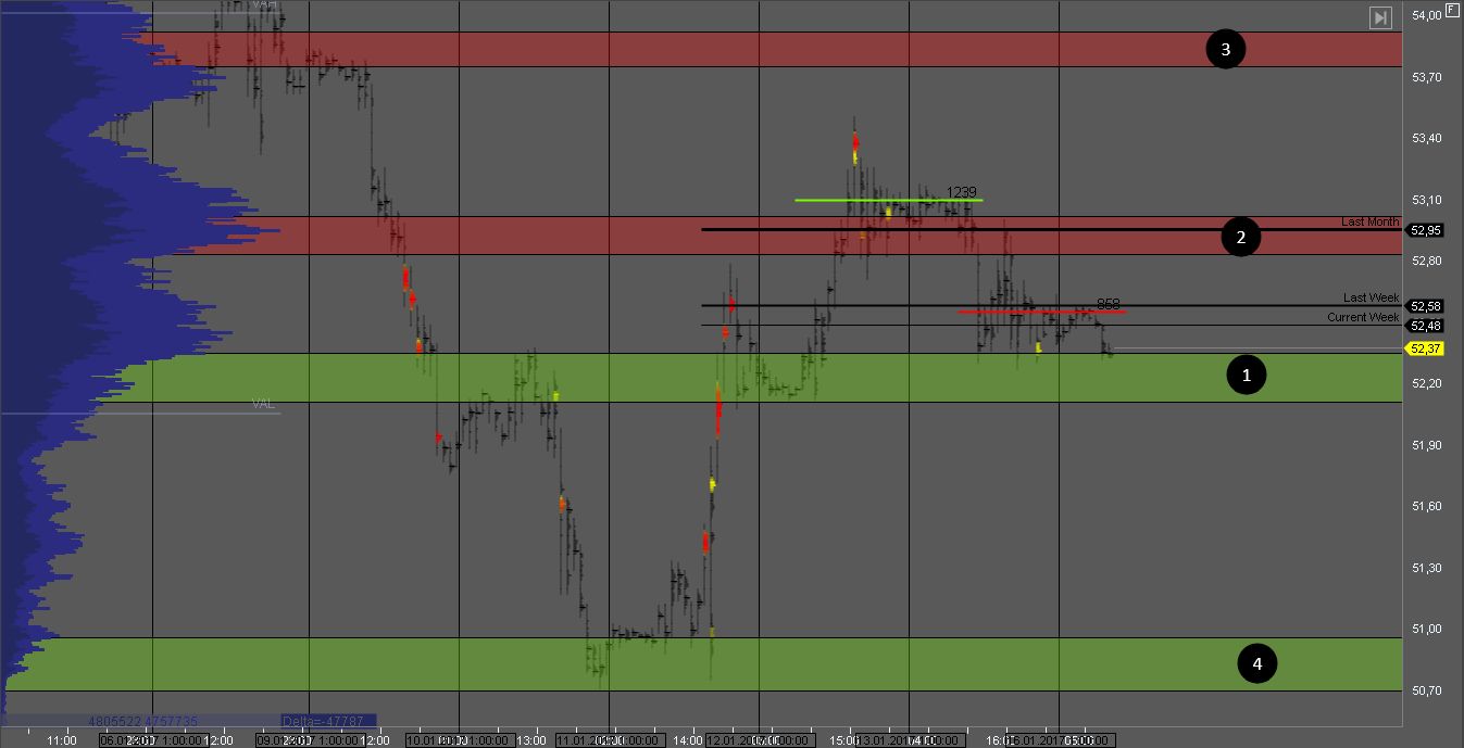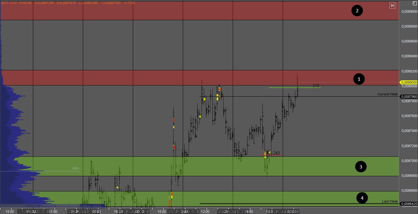 Покупатель пытается продавить зону сопротивления 2, для того что бы продолжить движение вверх к зону сопротивления 3. Если зона поддержки 1 будет пробита, продажи должны будут возобновиться к цели 4, откуда снова можно рассматривать покупки.