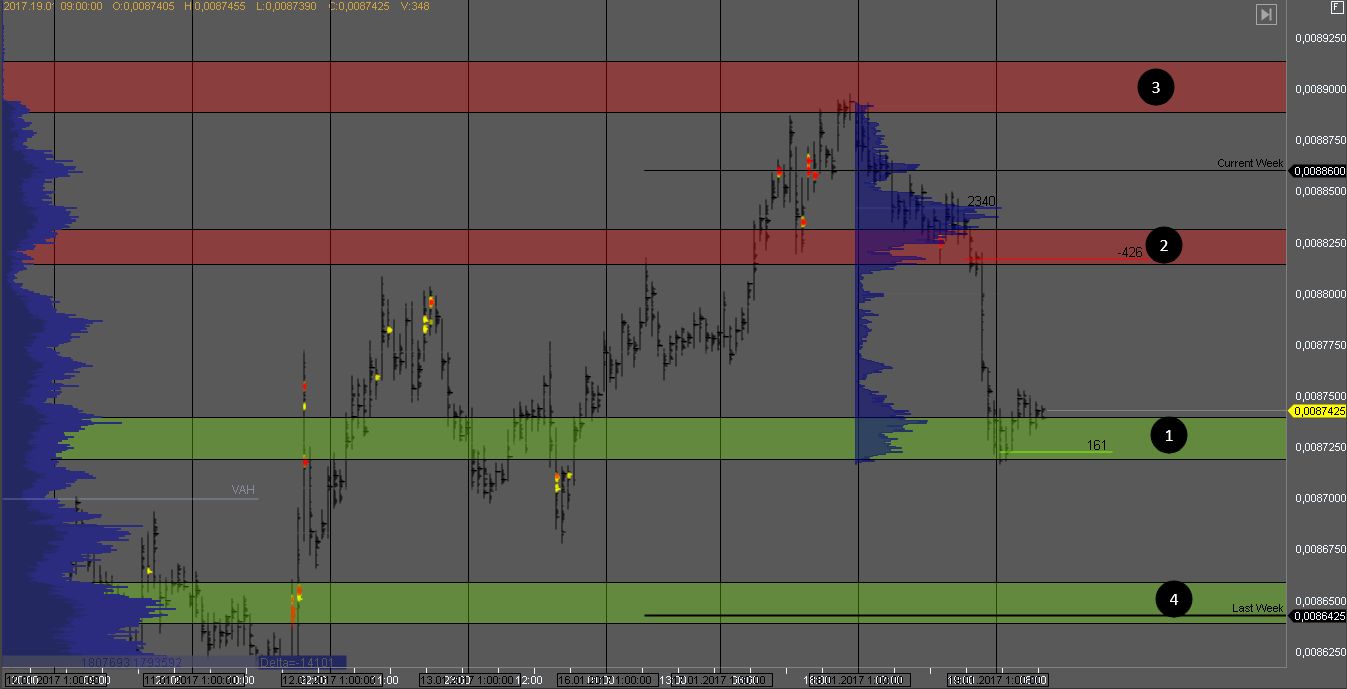 фьючерс USD_JPYЙена также торговалась под контролем продавцов на американской сессии и достигла цели в зоне 1. На данный момент лучшая цена для поиска продаж в зоне 2. Пробой зоны 1 даст возможность продавцам продолжить снижение к цели в зоне 4.