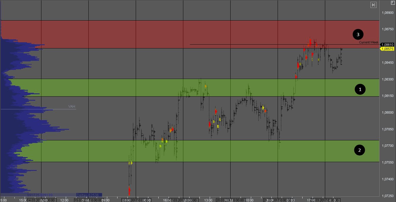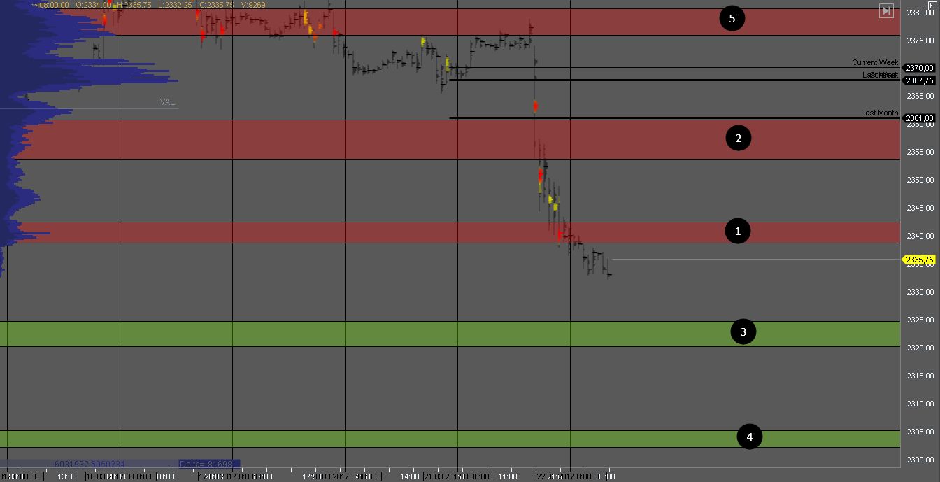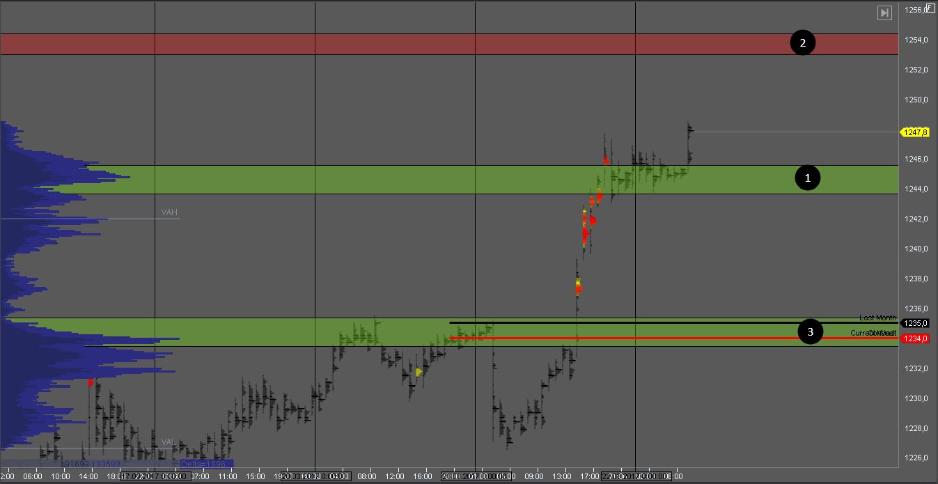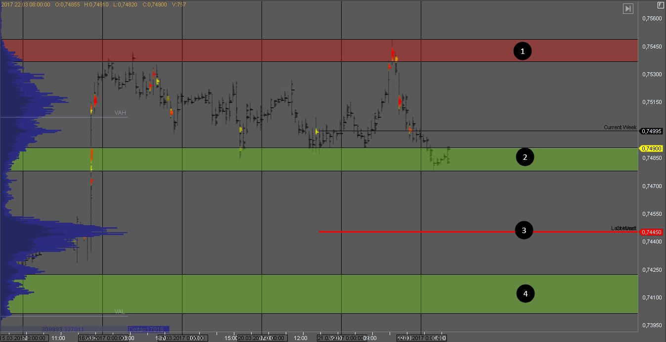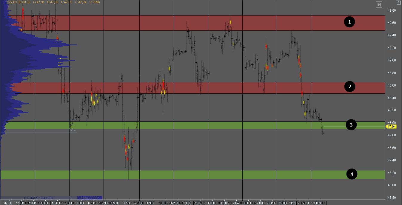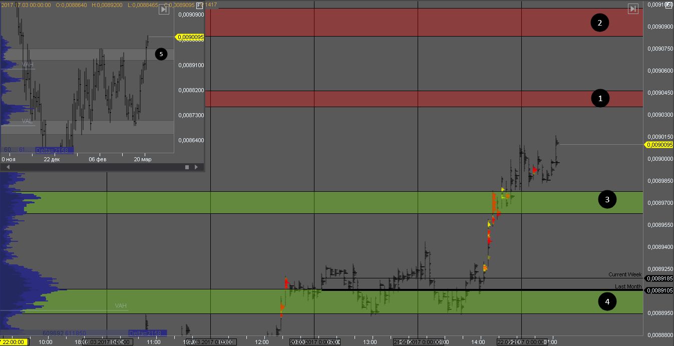 Пробив зону 1, мы получим признаки слабости покупателей. Покупки в такой ситуации рассматривать рискованно. При попытке пробоя зоны 3 нужно дождаться реакции рынка на этот пробой, так как зона 3 является зоной продавцов старшего ТФ.