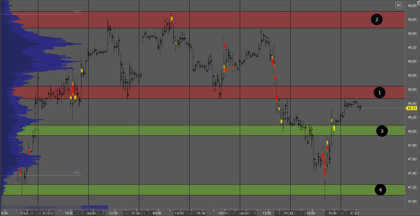 На повторном тесте зон 1 и 2 стоит рассматривать покупки внутри дня с целью в зоне 3. На тесте зоны 3 так же могут возникнуть возможности для краткосрочных продаж.