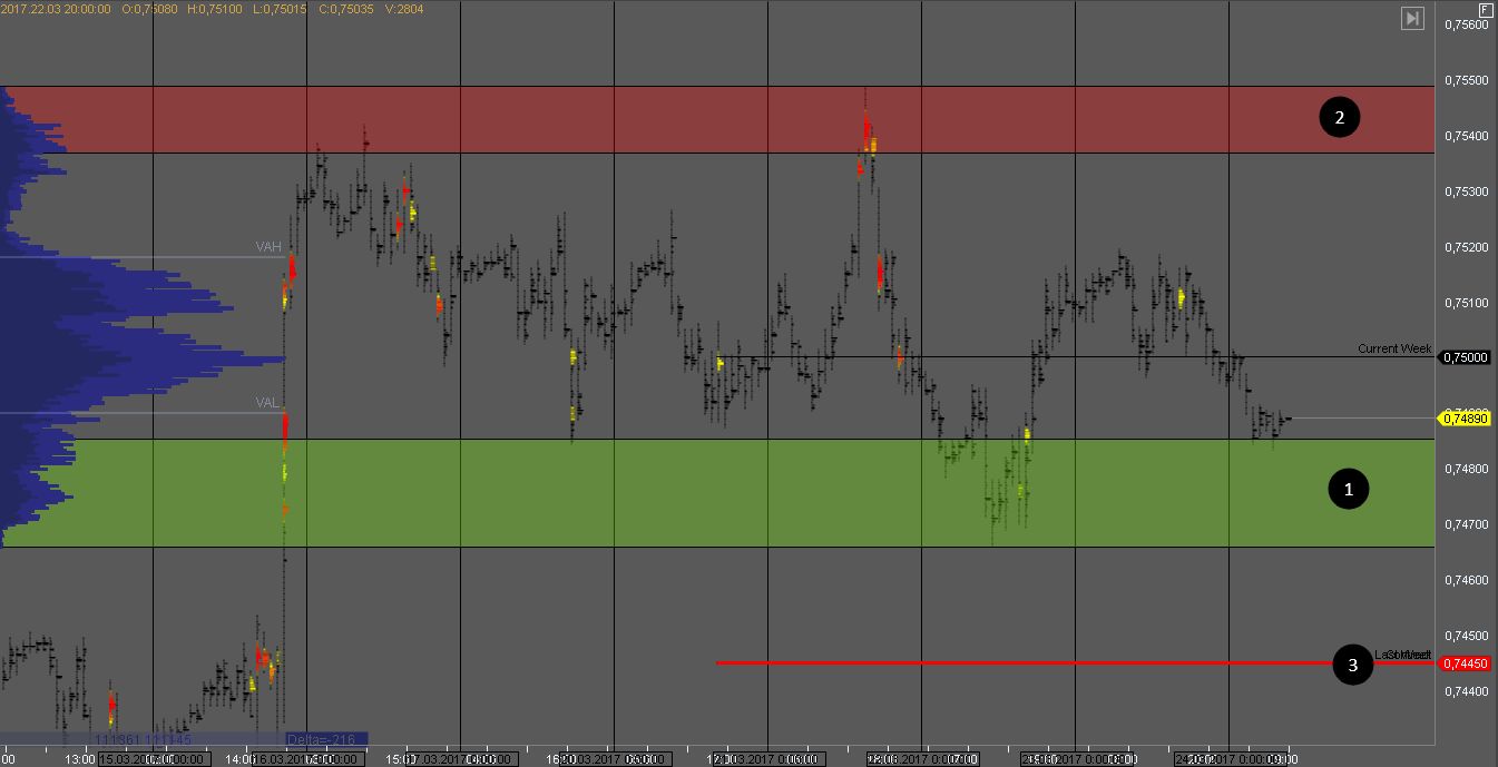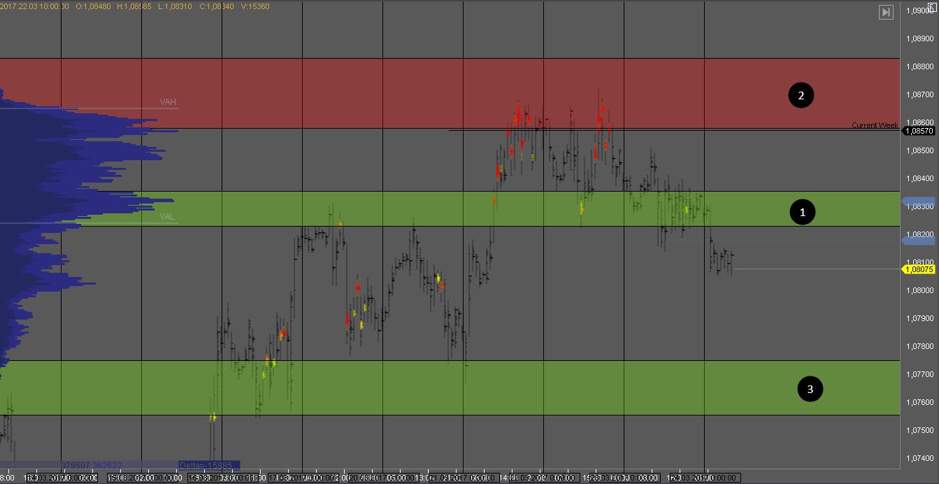 Продавец все-таки продавил поддержку 1 и пытается продолжить снижение к цели в зоне 3. На тесте зоны 1 можно рассматривать продажи, но если котировка пробьет эту зону, мы получим признаки слабости продавца. Продажи в таком случае желательно приостановить.