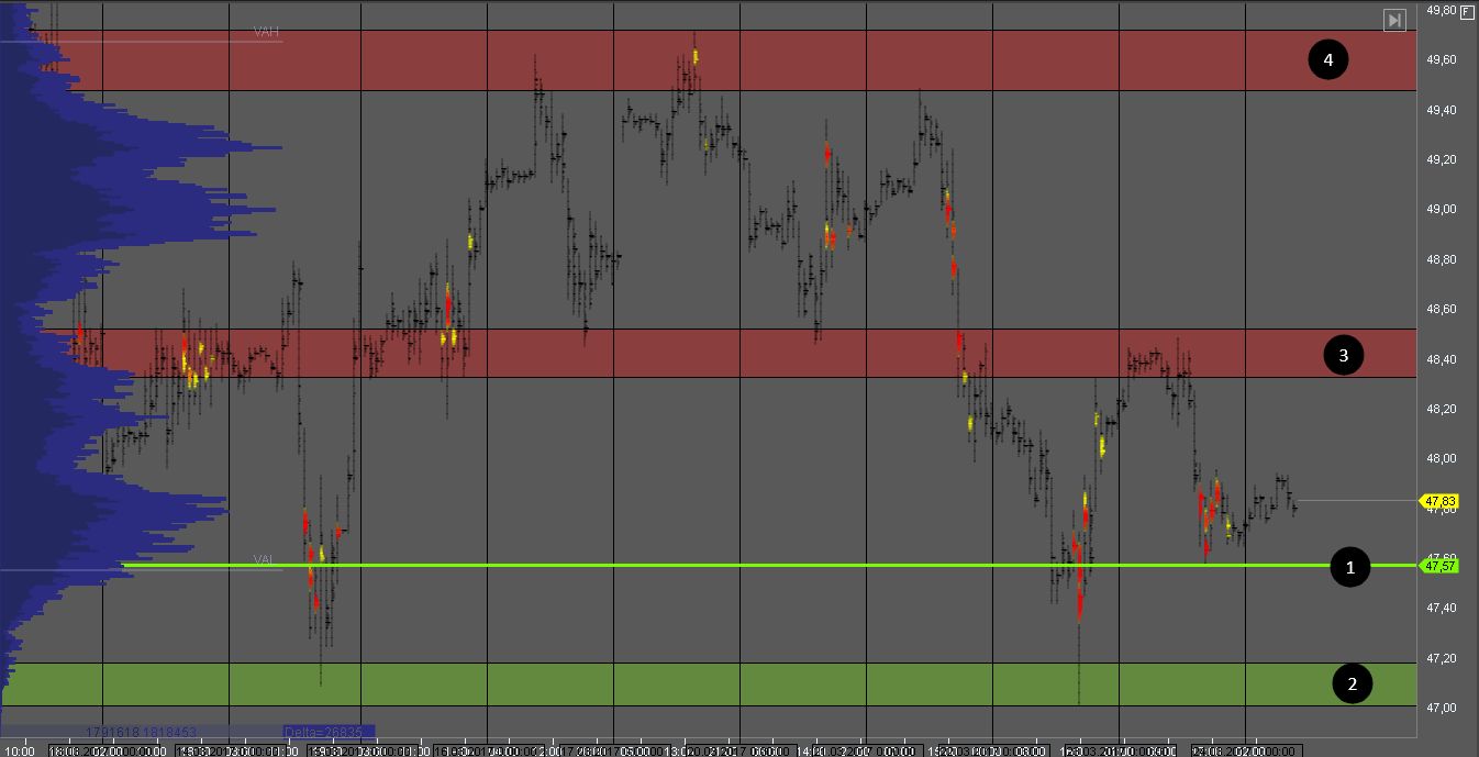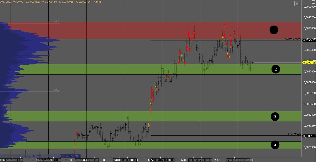В диапазоне 1-2 сформировался достаточно крупный объем, который может дать коррекцию к зонам 3 и 4, при наличии пробоя поддержки 2 и закрепления ниже него.