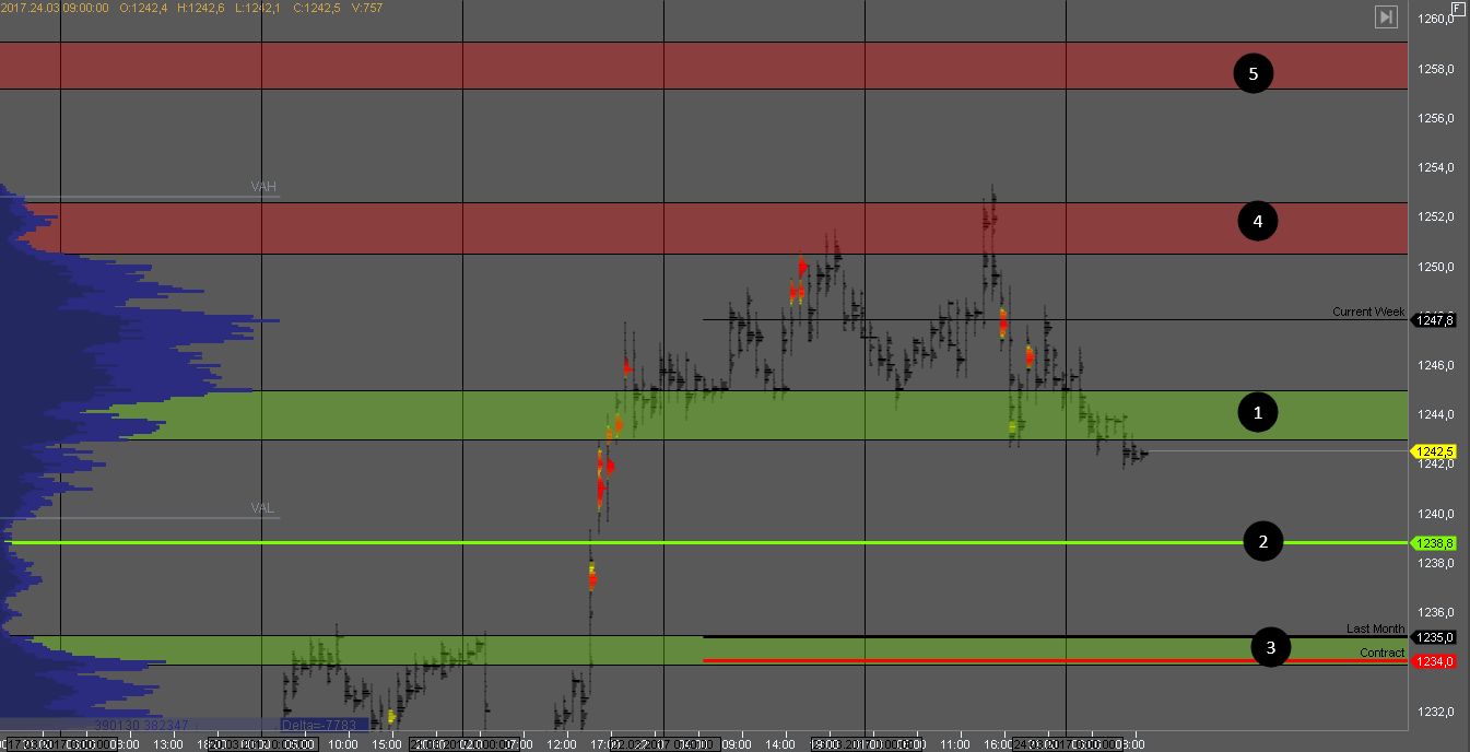 Продавец на золоте пытается продавить поддержку 1 и продолжить снижение к зонам 2 и 3. Если покупатель вернет цену выше поддержки 1, покупки должны продолжиться к зоне сопротивления 4, от которого краткосрочно можно искать продажи.