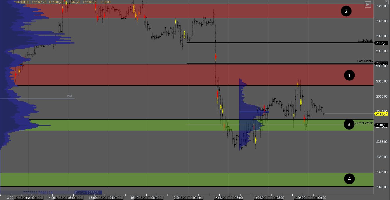 Коррекционный покупатель достиг цели в зоне 1 и продавец встретил котировку на индекс, вернув торги обратно в объем. На тесте зоны 3 можно искать паттерн внутри дня для краткосрочной покупки, но в случае пробоя нисходящее движение должно продолжиться к цели в зоне 4.