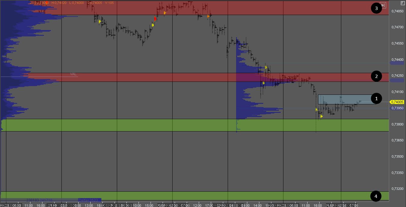 Канадец торгуется в нисходящей тенденции, но если будет пробита зона 1, коррекция должна продолжиться к зоне 2, откуда можно рассматривать возможности на продажу. При пробитии зоны 2 и объема продавца, покупатели должны взять под контроль котировку с целью в зоне 3. Пробой ближайшей зоны поддержки, подтвердит силу продавца, и трендовое движение должно продолжиться к зоне 4.