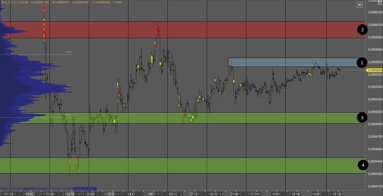 После снижения в конце прошлой недели, котировка находиться в коррекции с целью в зоне 2 с объемом продавца. В случае пробоя зоны 1, продажи могут возобновиться к зоне 4, а если зона 4 будет пробита, мы получим подтверждение силы продавца и тренд продолжиться к зоне 5. В районе зоны 2 можно рассматривать продажи, но если покупатель продавит зону 2, коррекция должна продолжиться глубже к зоне 3.