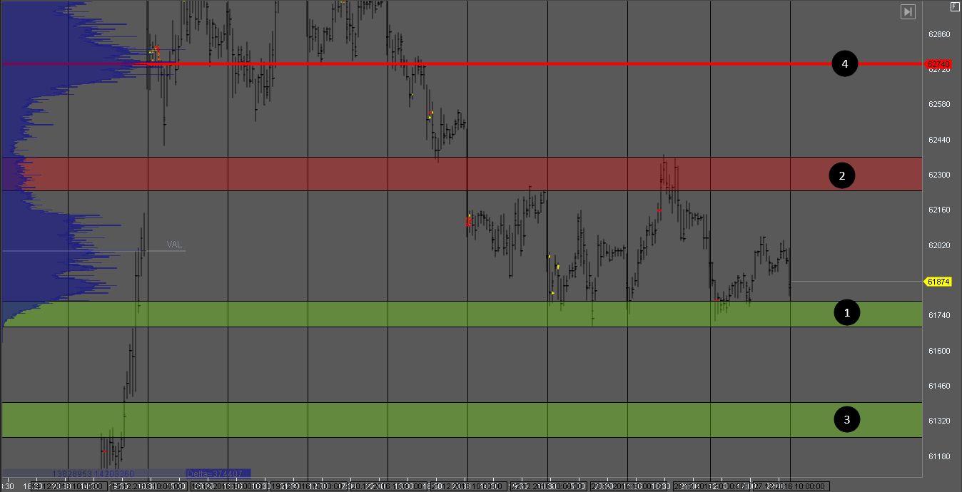 Индекс продолжает торговаться в середине консолидации с зоной сопротивления 1. Если покупателям удастся продавить эту зону, покупки должны возобновиться к цели в зоне 2, где снова можно рассматривать краткосрочные возможности для продажи. Покупки можно рассматривать на тесте зоны 3.