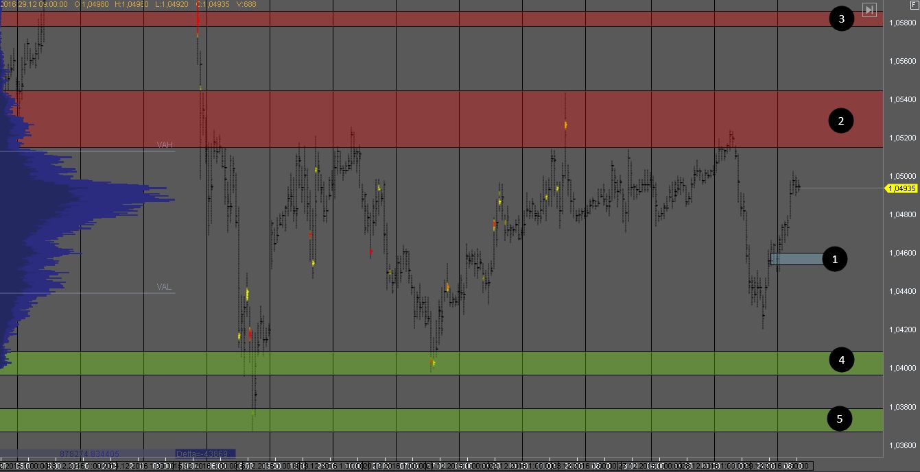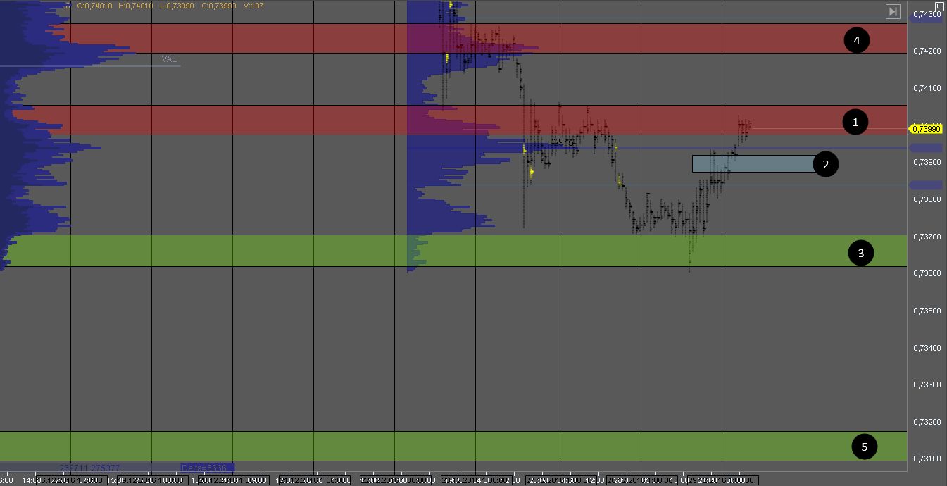 Продавец продавил котировку от сопротивления 2, и котировка продолжает торговаться в консолидации, между зонами 2 и 4. На данный момент идет еще один тест зоны 2, на котором можно рассматривать краткосрочные возможности для продажи. В случае пробоя зоны 2, желательно отложить поиск покупок и продаж и подождать как отреагирует рынок на этот пробой.