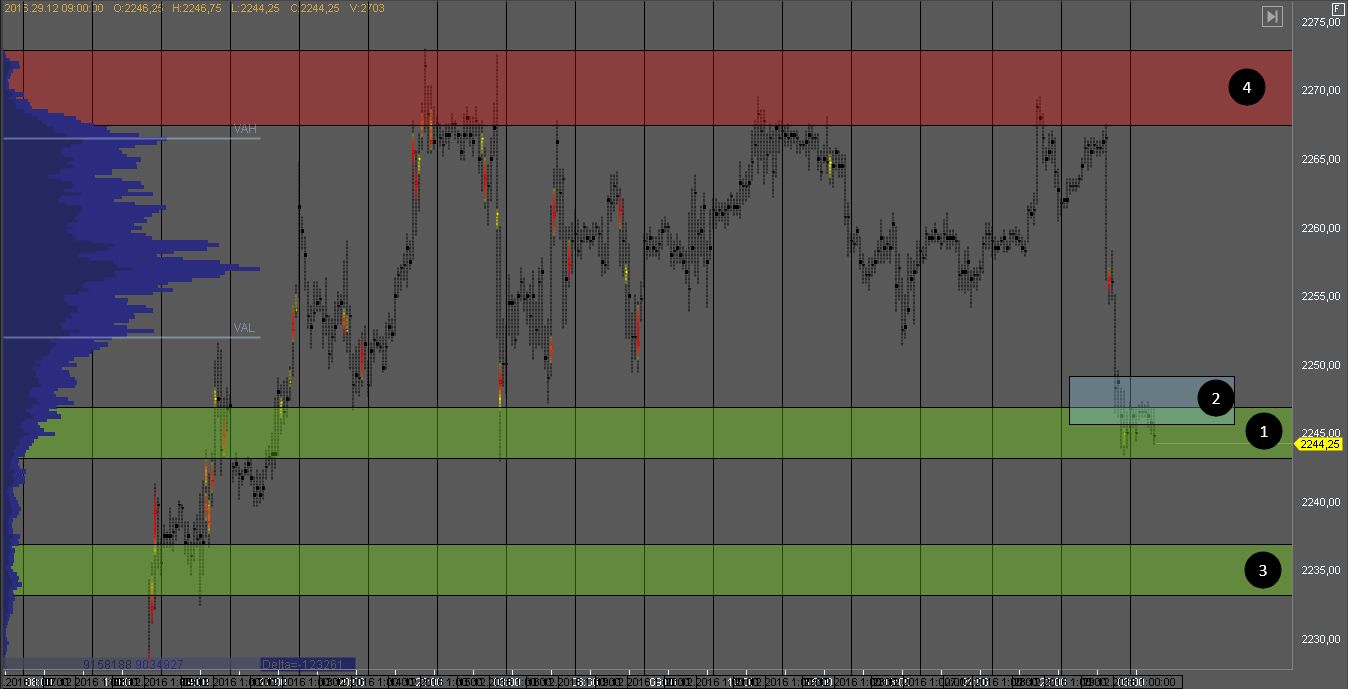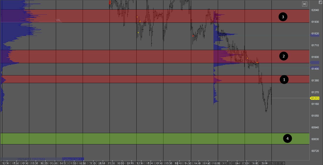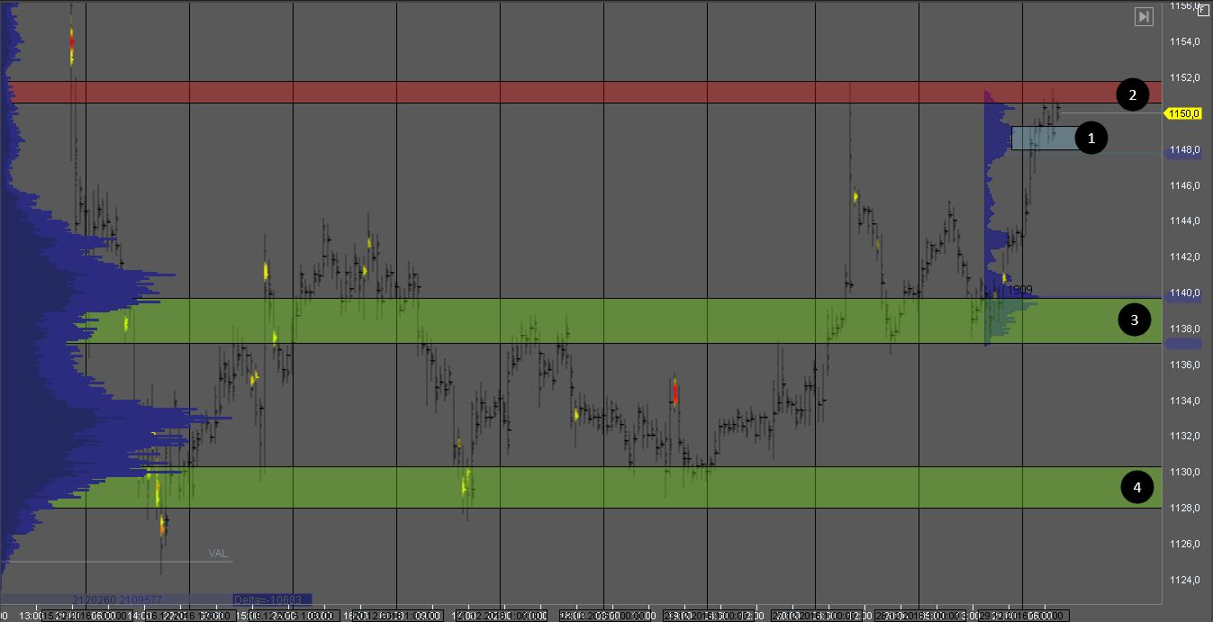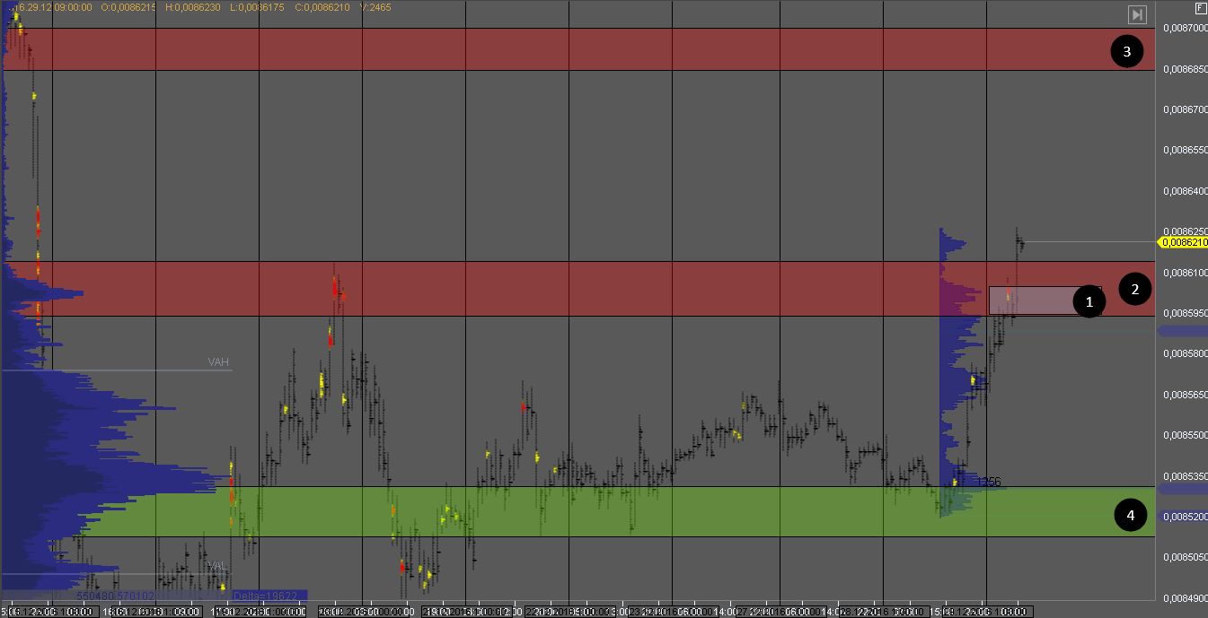Покупатель пытается продавить сопротивление в зоне 2. Локальная зона поддержки 1 с объемом покупателя должная удержать котировку от падения на тесте. Если же продавец продавит зону 1, мы получим признаки ложного пробоя, и покупки рассматривать станет рискованно. Цель для покупателей зона 3, для продавцов зона 4.