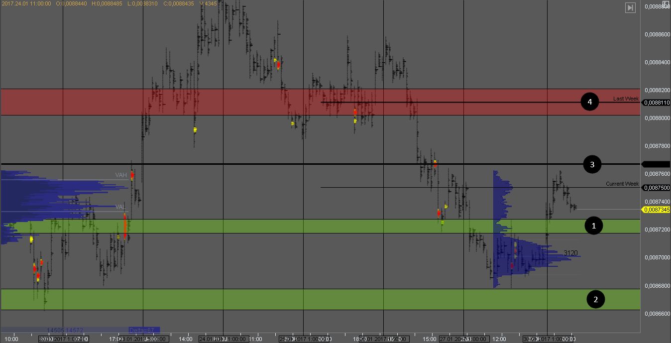 Покупатель на йене продавил зону сопротивления 1 и вышел из объема вверх. НА тесте зоны 1 можно искать краткосрочные покупки с целями в зоне 3 и 4. Если зона 1 будет пробита нужно отложить поиск сделок и посмотреть на реакцию рынка на этот пробой.