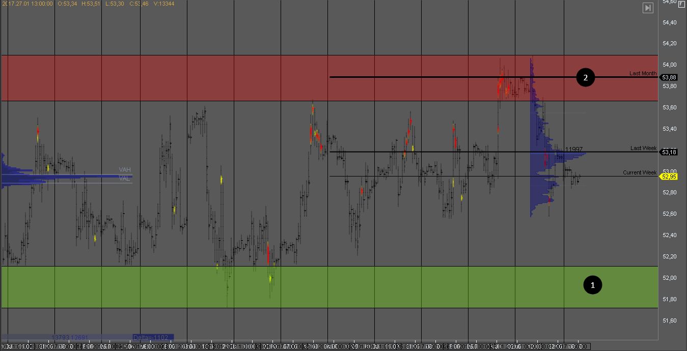 Покупатель после пробоя зоны сопротивления, не смог удержать котировку и вернулся обратно в консолидацию. На тесте зоны 2 можно искать возможности для продажи. Так же уровень 53.18 с локальным объемом продавца, может быть локальной зоной сопротивления. На тесте поддержки можно рассмотреть возможности для покупок.