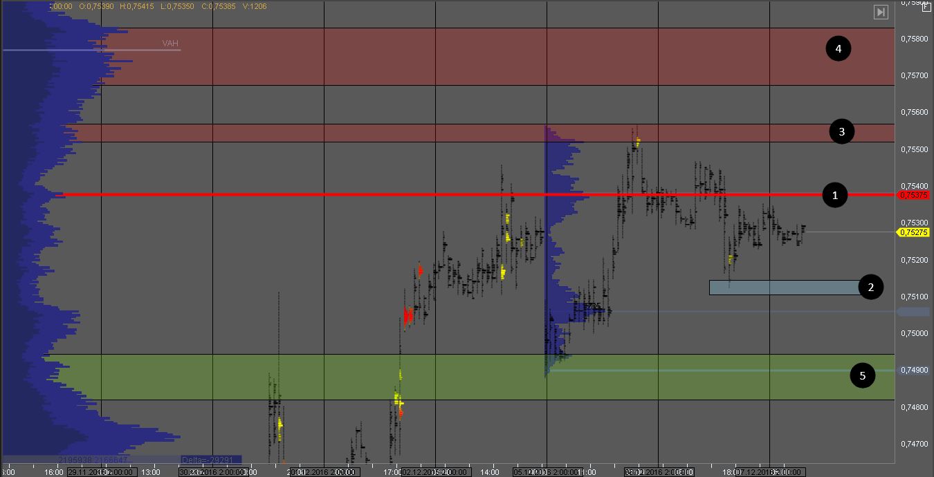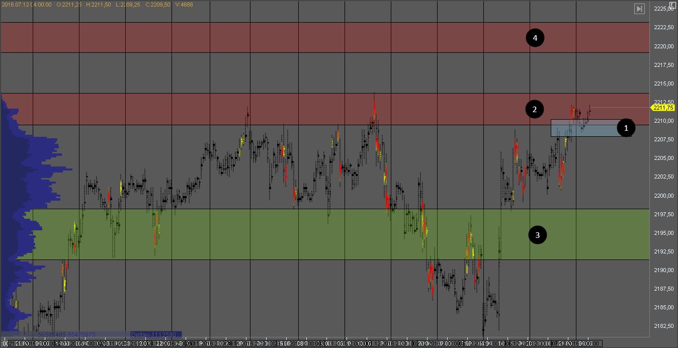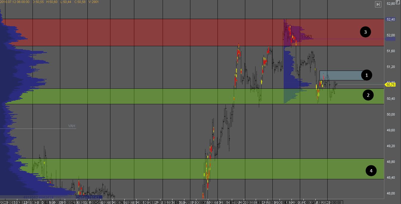 Покупатель пытается продавить зону сопротивления 2. Зона 1 выступает поддержкой и в случае пробоя, продажи должны возобновиться к зоне поддержки 3, откуда можно возобновить поиск краткосрочных покупок.