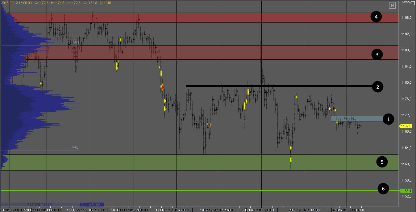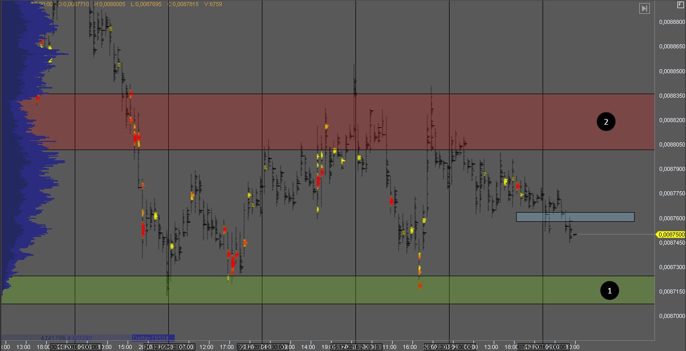 Продавец взял под контроль котировку, пробив последний объем покупателя. На данный момент зона 1 выступает сопротивлением и на ее тесте можно рассматривать краткосрочные возможности для продажи. Зона 2 интересна для краткосрочных покупок. В случае пробоя зоны 1, краткосрочные продажи снова можно рассмотреть на тесте зоны 3.