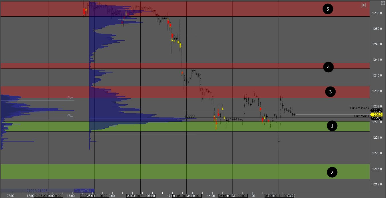 Золото формирует консолидацию с объемом и границами 1 и 3. В случае пробоя зоны 3, мы получим признаки слабости продавца, и восходящее движение может продолжиться к цели в зоне 5.