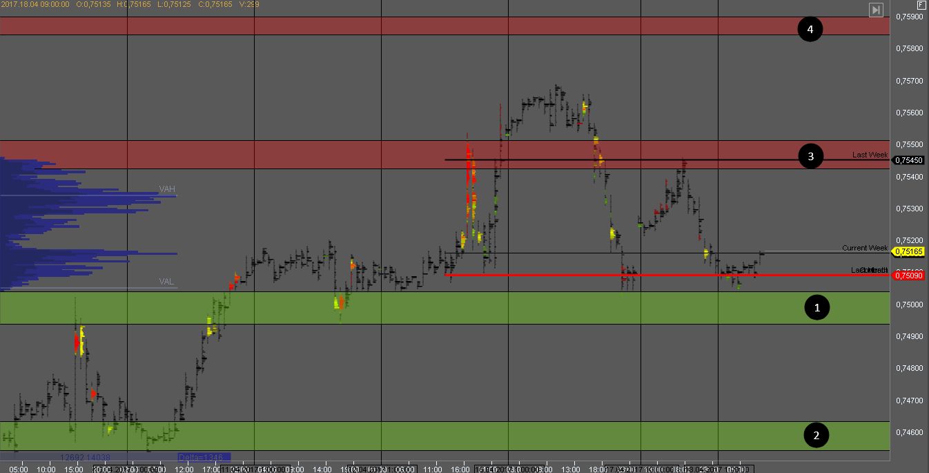 Канадец также торгуется в диапазоне между зонами 1 и 3. На тестах этих границ можно рассматривать краткосрочные сделки на отскок при наличии паттерна.