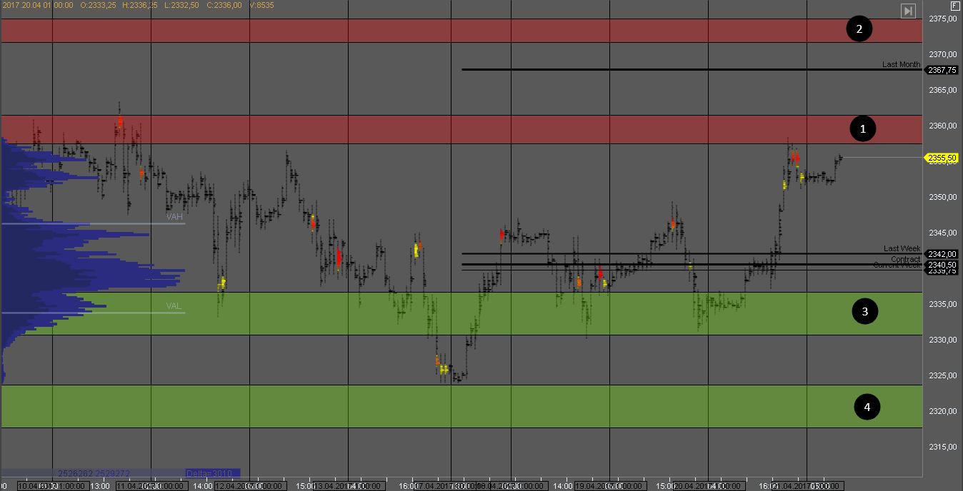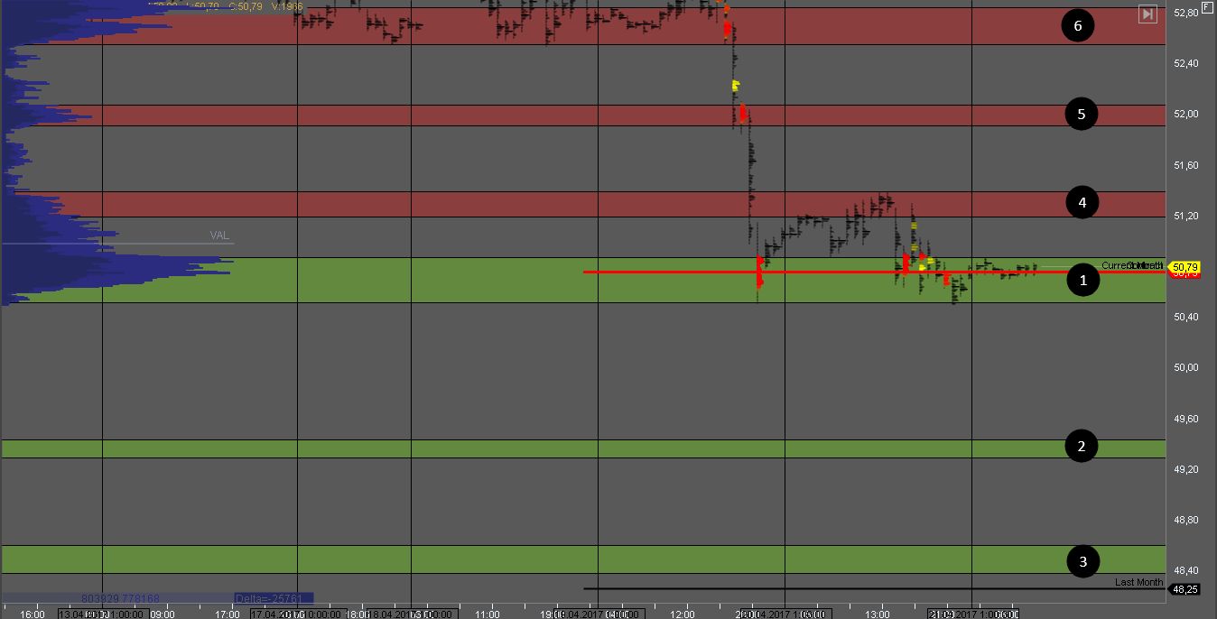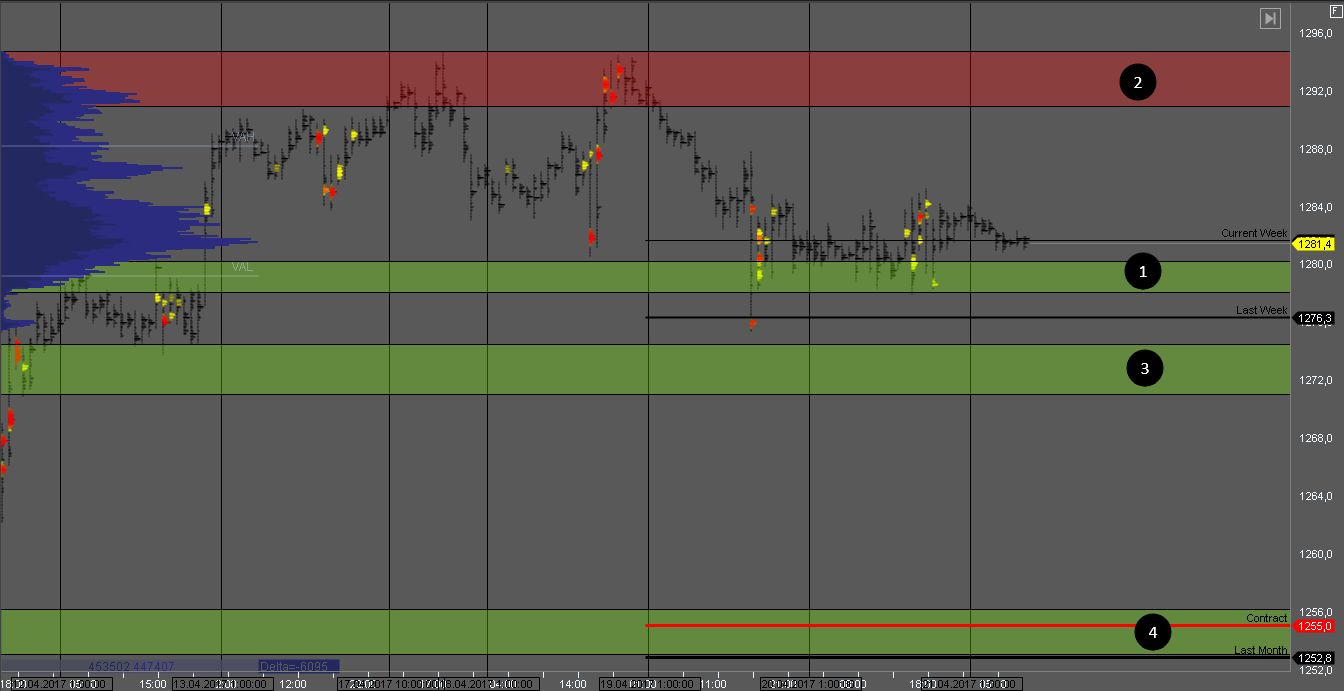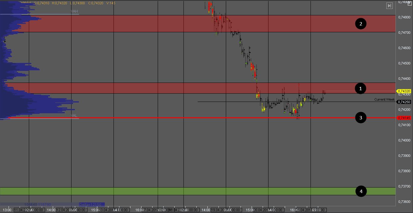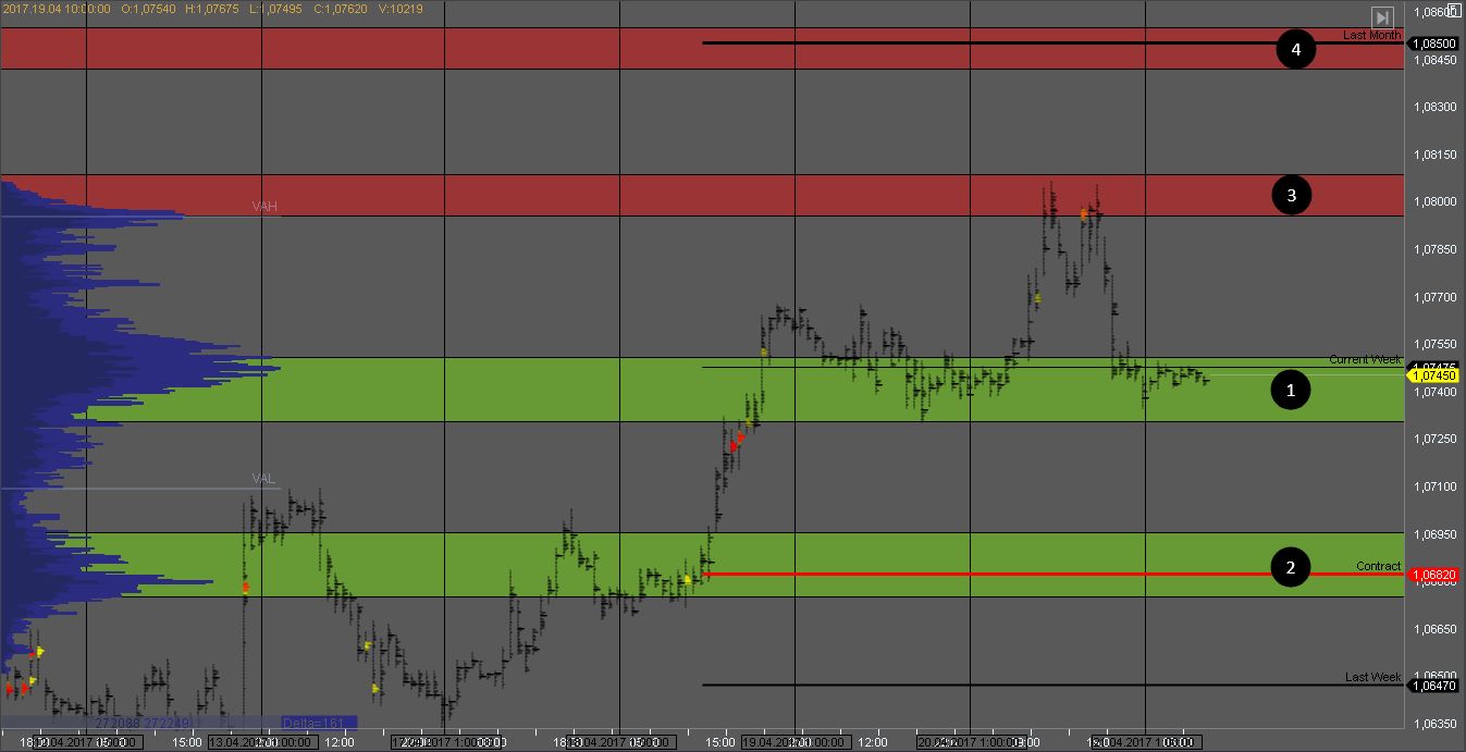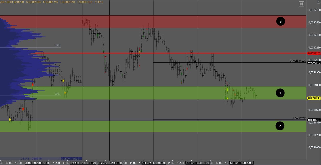 Покупатель взял под контроль котировку у зоны поддержки 3, сформировав там объем недели. Покупатель достиг первой цели в зоне 1.