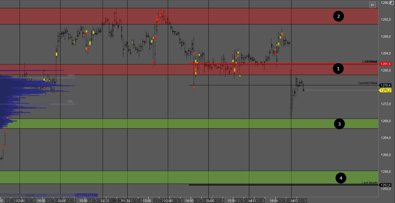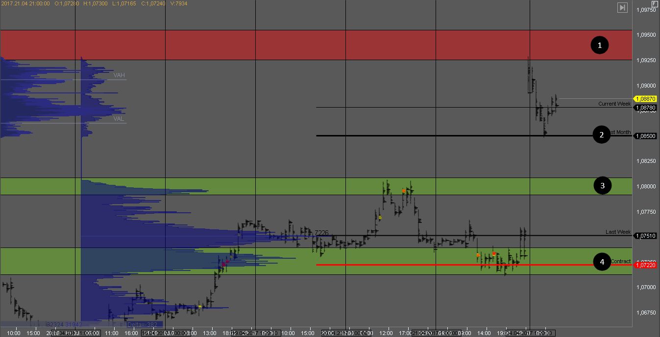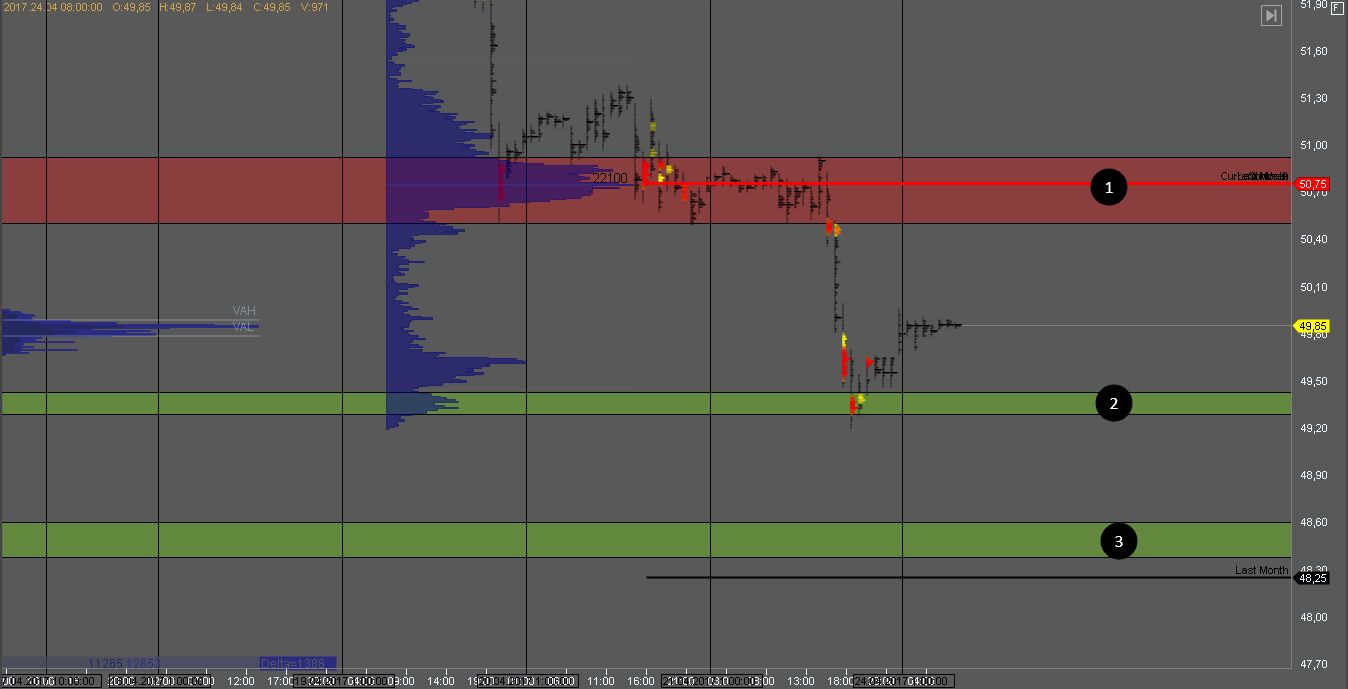 Продавец пробил зону 1 и на ее тесте можно рассматривать возможности для продажи с целью в зоне 3. В случае, если зона 1 снова будет пробита и котировка вернется в консолидацию с объемом, поиск продаж нужно остановить.