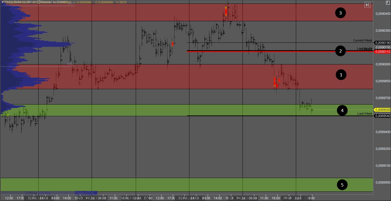 Йена продавила зону, 1 сформировав большой кластер. На тесте этого объема внутри дня можно искать возможности на продажу.