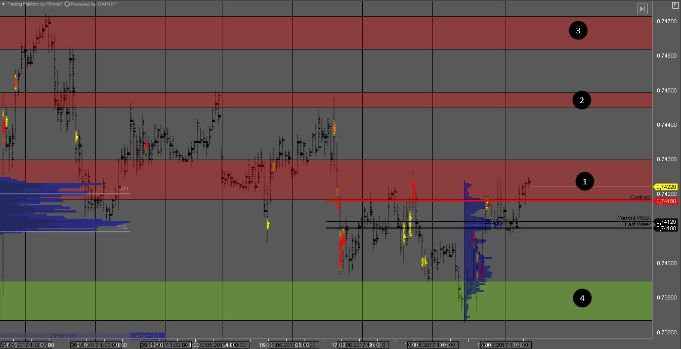 Йена, после пробоя экстремума в районе зоны 1, не смогла закрепиться вверху и на данный момент торгуется под контролем локального продавца.
