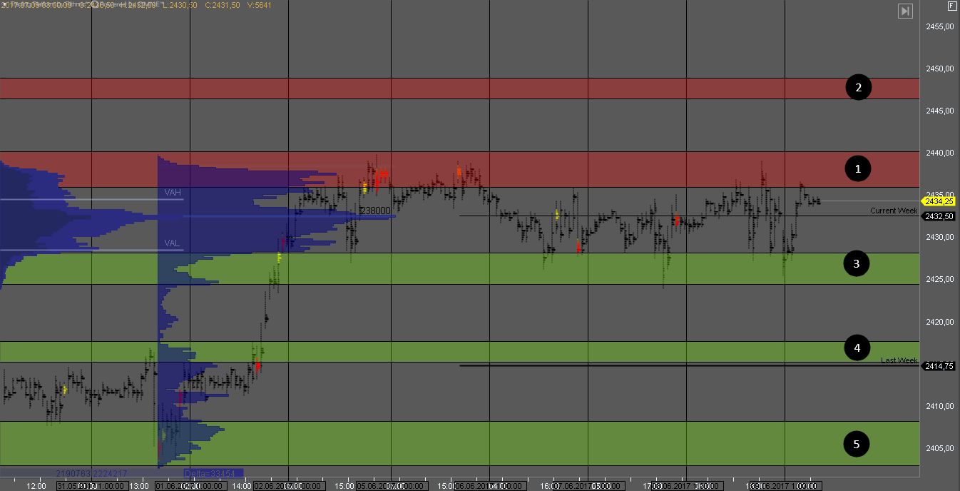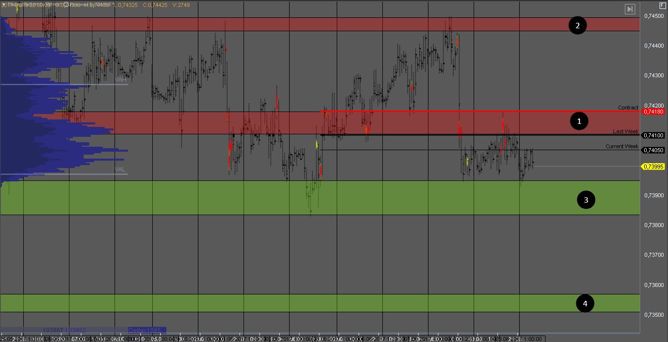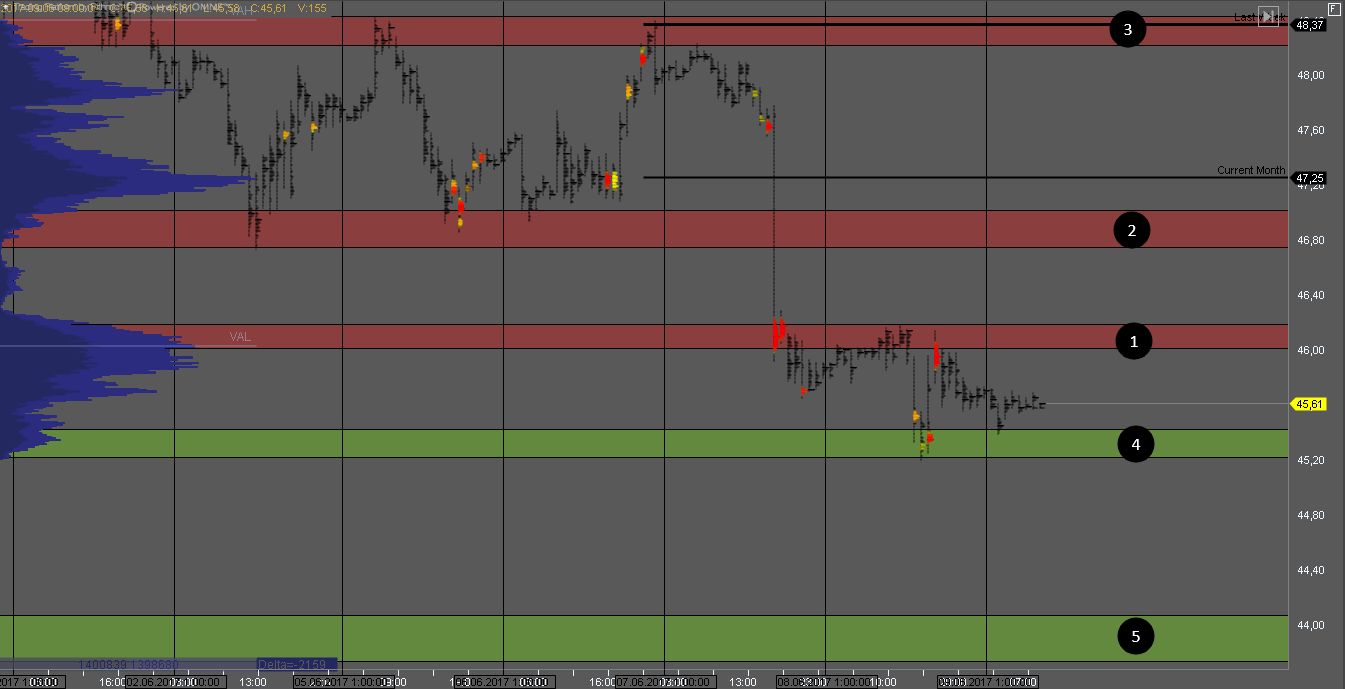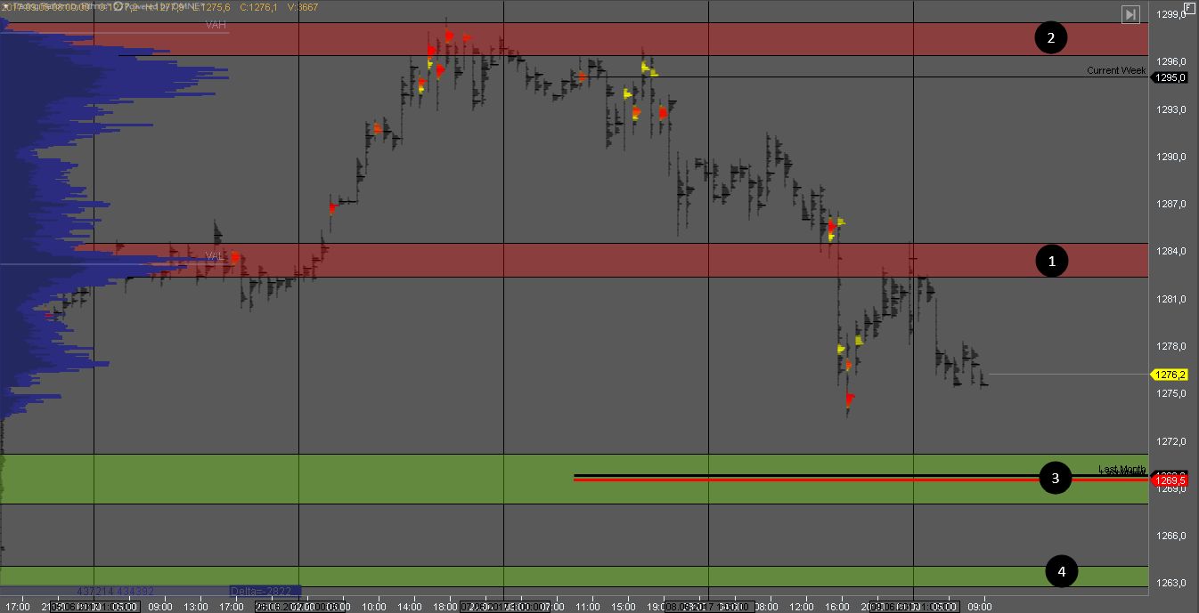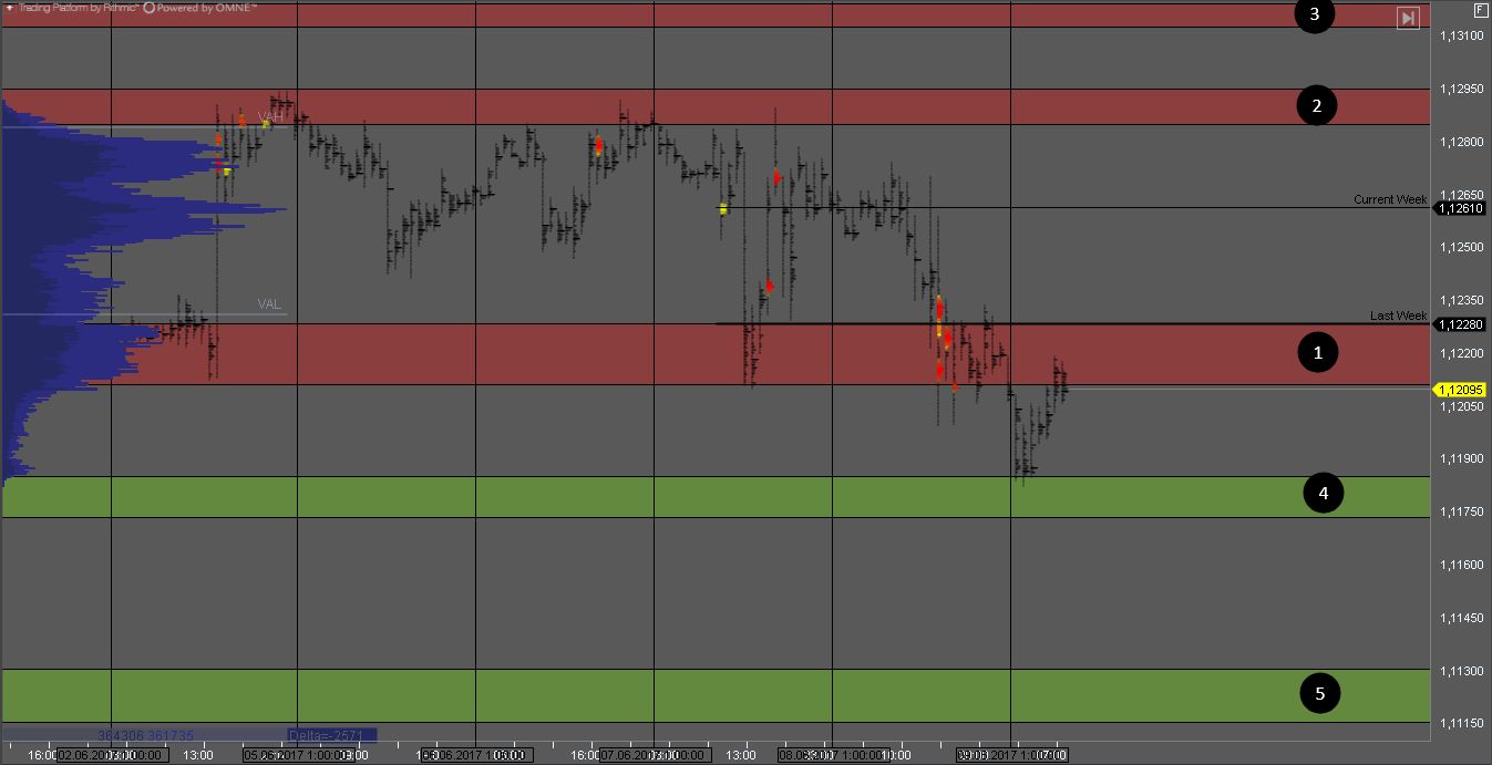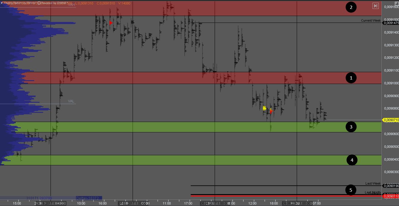 Продавец контролирует котировку продавив зону 1 и сформировав крупные кластера объема. На тесте сопротивления можно искать продажи с целями в зонах 4 и 5.