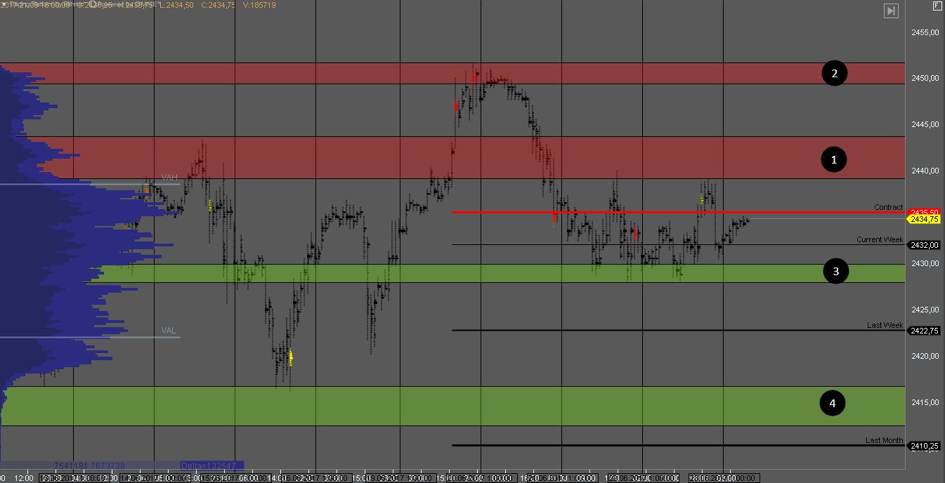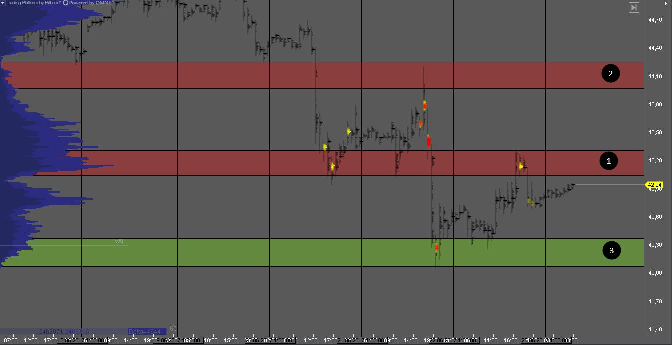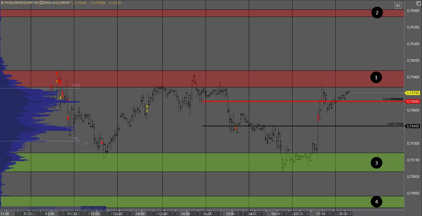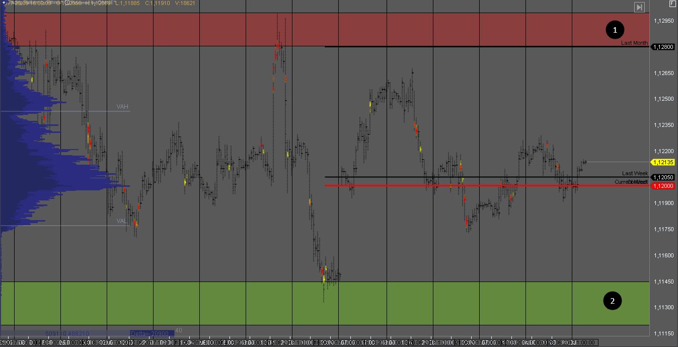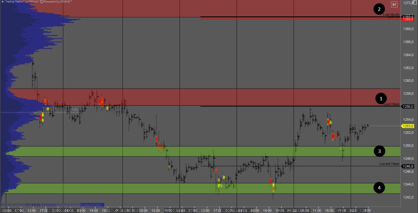 Если зона 1 будет пробита, мы получим признаки слабости продавца, и поиск продаж нужно будет приостановить. Движение вверх может продолжиться к цели в зоне 2.