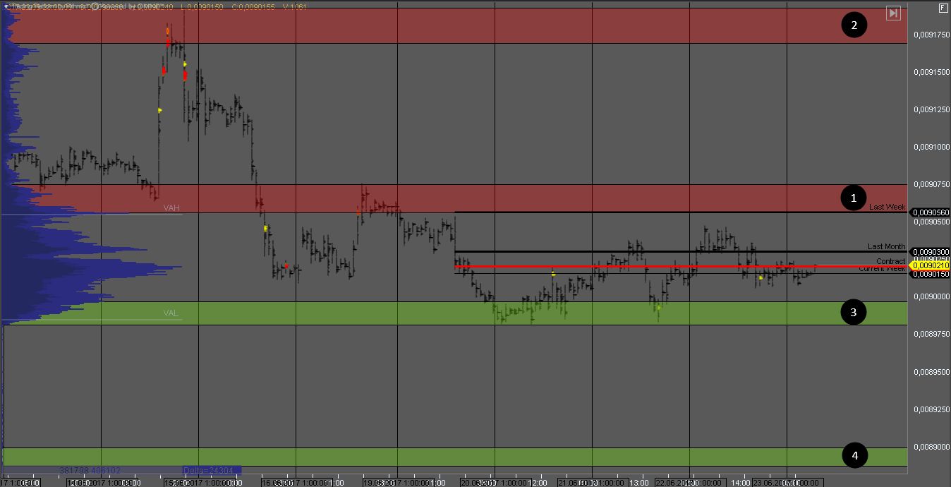Йена продолжает торговаться в консолидации с границами 1 и 3. На тестах границ можно искать краткосрочные возможности на отскок. Выход из объема может дать возможность поискать внутри дня трендовые формации.