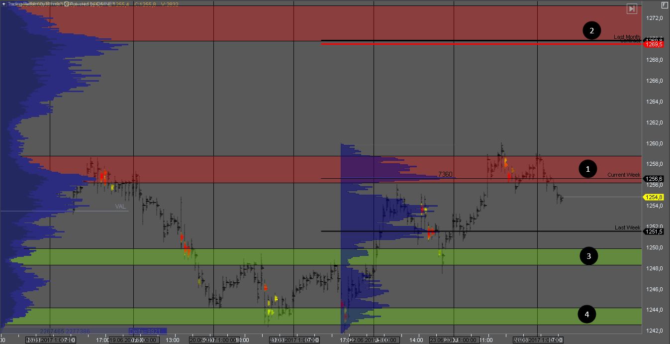 Покупатель на золоте пытался пробить сопротивление 1, но продавец удержал котировку на крупных кластерах.