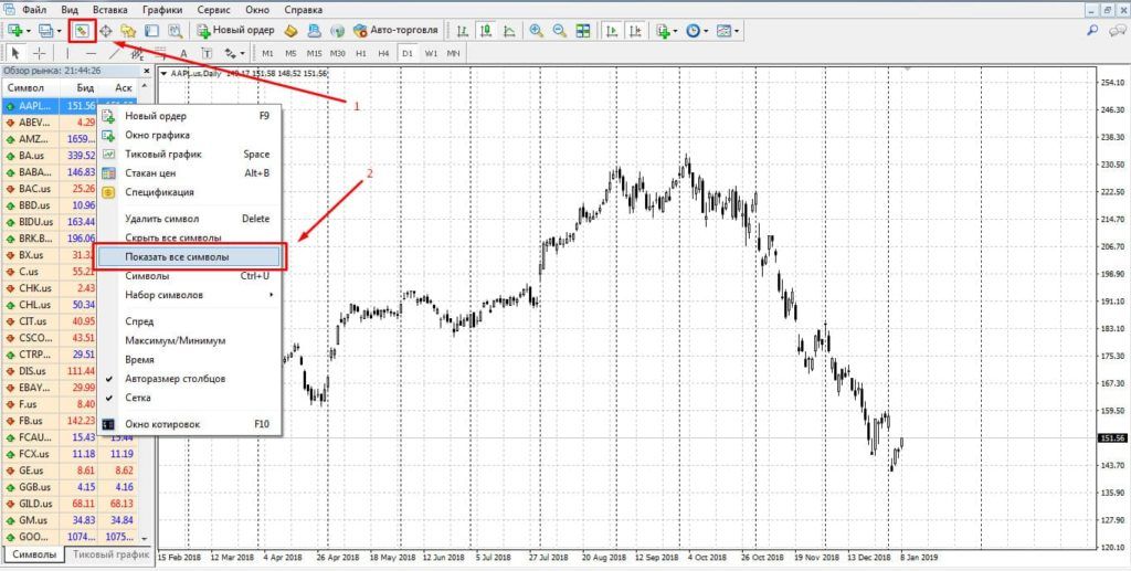 После этого вам потребуется открыть окно «Обзор рынка», кликнуть на нем правой кнопкой мыши и в появившемся меню выбрать пункт «Показать все символы». Вы увидите перечень всех контрактов на разницу, которые предоставляются для работы.