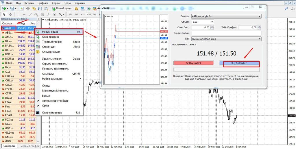 Для открытия сделки необходимо выбрать интересующую акцию, к примеру бумагу компании Apple (AAPL), и, как в случае с валютными парами, кликнуть на ней правой кнопкой мыши и в контекстном меню выбрать «Новый ордер».